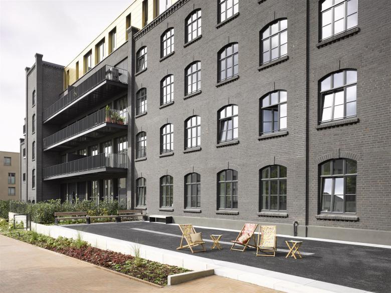 Im südlichen Gebäudeteil befinden sich 18 moderne Wohnungen mit variierenden Wohnflächen von 50 bis 150 m². Großformatige Fenster, gusseiserne Stützen und stützenfreie Stahlbetonträger kennzeichnen die Wohnräume und bewahren den industriellen Charme der alten Fabrik. Die Stützen aus Gusseisen wurden aus brandschutztechnischen Gründen aufwändig aufgearbeitet. Eingestellte Boxen bilden losgelöst davon die Infrastruktur mit Bad, Küche, Gäste-WC und Schrankelement. So entstanden in Zusammenhang mit den großen Fenstern großzügige Loftwohnungen mit fließen-den Räumen. Durch die Ost-West Ausrichtung gibt es zudem viel Licht. Eine Etage wurde auf das Dach gesetzt, sodass weitere Wohnfläche generiert wurde, ohne die denkmalgeschützte Struktur zu verändern. Gemeinsam mit den umliegenden Wohnungsbauten, die in den vergangenen Jahren auf dem Areal geschaffen wurden, entstand ein begrünter Innenhof.