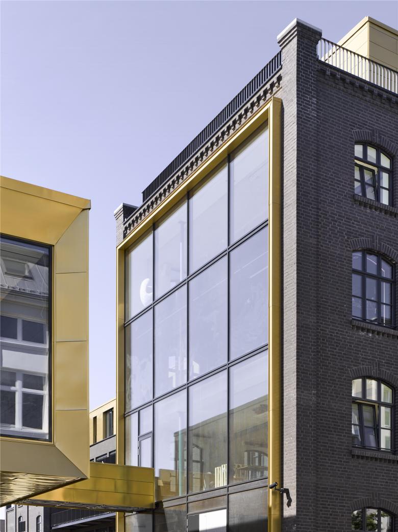 Der Charakter des alten industriellen Hauptgebäudes wurde teilweise beibehalten, teilweise bewusst unterbrochen. Das gesamte Gebäude wurde durch ein Staffelgeschoss erweitert. Der alte, undefinierte helle Bestandsziegel wich einem dunklen, fast schwarzen Klinker mit dunklen Fugen. Dieser dunkle Klinker entspricht in etwa dem Bestand von 1897. Ebenso wurden historische Aufbauten am Gebäudeabschluss rekonstruiert. Dem gegenüber steht das Staffelgeschoss, das sich ganz klar vom Bestand abgrenzt in Formensprache und vor allem Materialität. Eine goldene Blechverkleidung dient als Eyecatcher.