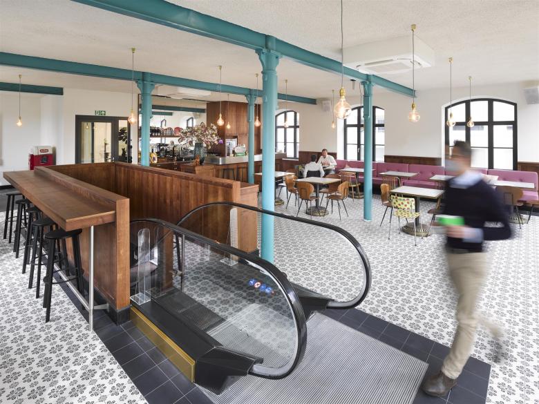 Die verschiedenen Themenwelten bei den Büroflächen sind hauptsächlich über die neu verglaste Ostfassade einsehbar. Ein Rundgang durch das Gebäude offenbart eindrücklich, wieviel Herzblut in jedem Detail der Innenausstattung steckt. Eine goldene Rolltreppe bringt Gäste und Mitarbeiter vom Empfang im Erdgeschoss direkt in die 60er Jahre Bar Centrale im ersten Obergeschoss. Die bietet an schweren Kaffeehaustischen und stilechten Sitzgelegenheiten einen öffentlich anmutenden, anregenden Arbeitsrahmen. Von hier gelangt man über die goldene Brücke im Freien in den benachbarten Pavillon mit der Turnhalle im ersten Geschoss. Darunter, im ehemaligen Pförtnerhaus befindet sich der große Besprechungsbereich, der mit der Neonleuchtreklame „lasst Blumen sprechen“ unter der Decke überrascht.