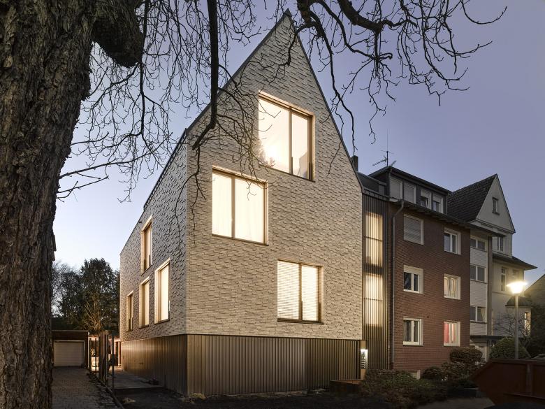 Gebäudeform und Fassadengestaltung orientieren sich in abstrahierter Form an der Nachbarbebauung. Die Giebelform des Daches wird aufgenommen, das Dach dreht sich zugleich in Richtung des angrenzenden Reihenhauses. Auch der Klinker nimmt die Farbigkeit der beigen Putzfassade auf. Der Gebäudesockel springt in gleicher Ausbildung zurück. Die Materialität besteht aus natursteinfarbigem Klinker und Fassadenblechen.