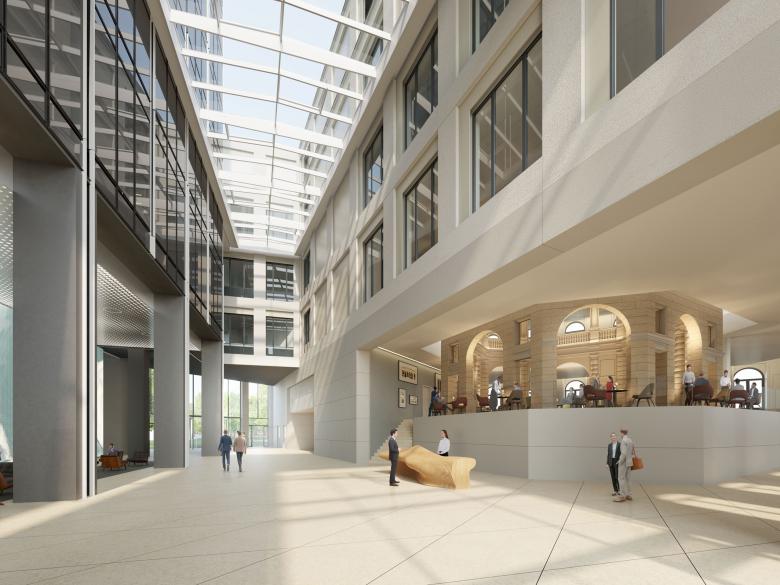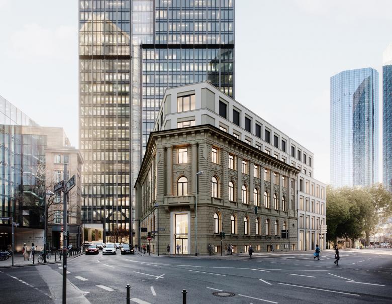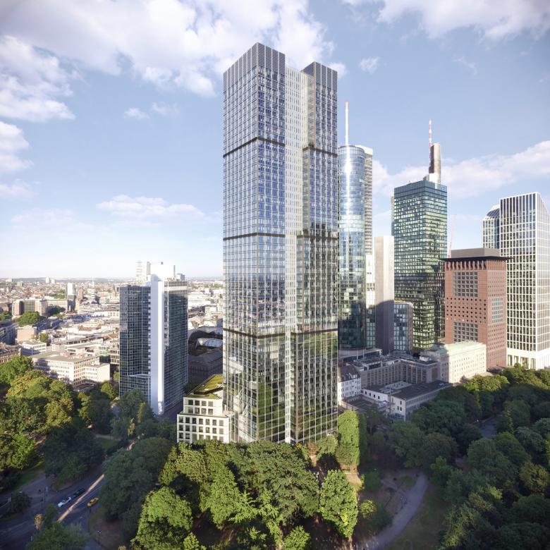 Das Credo unserer Entwurfsarbeit lautet: Ort, Kontext, Zeit und Nutzung einbeziehen. An der Mainzer Landstraße gab es bereits ein Neorenaissance-Bestandsgebäude, eine historische Rotunde - eine der wenigen erhaltene Kassenhallen eines Bankgebäudes aus dem Historismus -und viele moderne Hochhäuser. So entschieden wir uns bewusst für ein hybrides Ensemble. Anders als bei konventionellen Bürotürmen bildet unser Entwurf eine Triade aus Hochhaus, historischen Sockelbau mit Museum und öffentlicher Passage. Im Erdgeschoss entsteht eine durchlässige Eingangsebene zwischen Neuer Mainzer Straße und Wallanlagen als überdachter öffentlicher Raum. Über fünf Etagen erstrecken sich die öffentlich zugänglichen Nutzungen wie Restaurants, Café, Weinbar und Museum. Durch die publikumsintensive Verknüpfung von Büronutzung, Alltagsleben und Kultur erreichen wir, dass Stadtleben und Arbeitswelt ineinandergreifen.