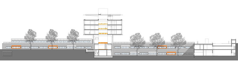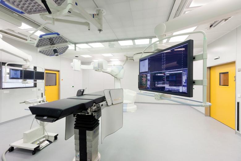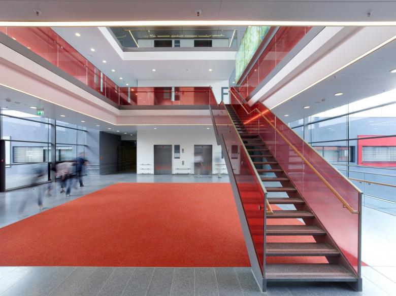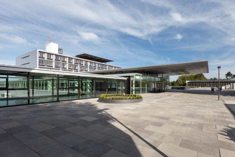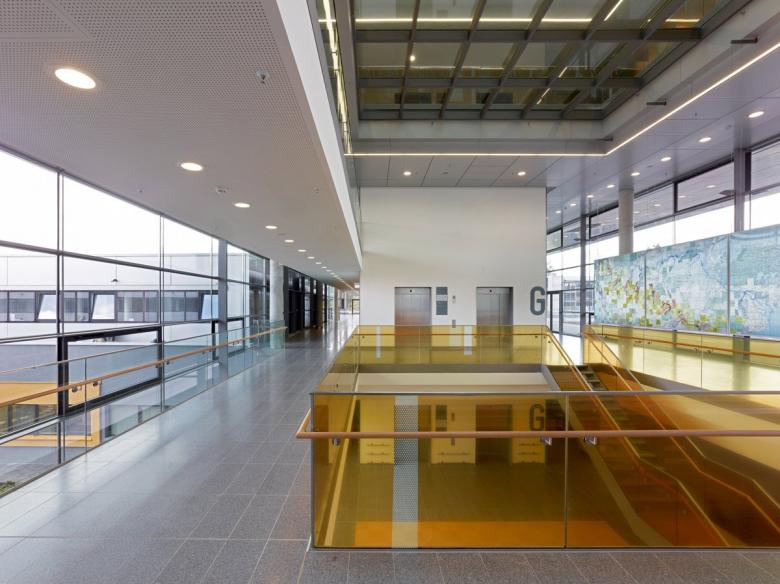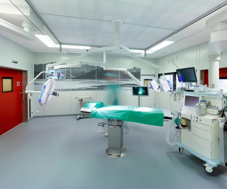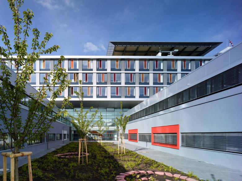Die Chirurgische Klinik mit 15 OP-Sälen, 235 Normalpflege- und 80 Intensivpflegebetten gliedert sich in einen 2- bis 3-geschossigen Sockel, der sämtliche Funktionsbereiche beherbergt und ein „schwebendes“ Bettenhaus. Farblich variierende Öffnungsflügel bringen eine besondere Lichtstimmung in jedes Patientenzimmer. Vier warme Farbtöne – Gelb, Orange, Rot und Braun – sind Teil des Gestaltungskonzeptes und finden sich im gesamten Gebäude wieder. Sie sorgen für ein freundliches, helles Ambiente.