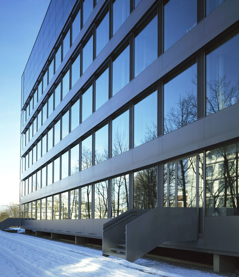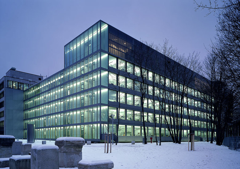 Das 1980 von unserem Büro geplante Gebäude wurde innerhalb eines engen Kosten- und Terminrahmens bei laufendem Betrieb teilsaniert und um einen Neubau ergänzt. Neues und bestehendes Gebäude sind jeweils L-förmige Baukörper, die einen begrünten Innenhof umschließen. Während der Bauzeit musste eine 24h- Notrufzentrale aufrecht erhalten und das Rechenzentrum verlegt werden. Das Spektrum der Bürobereiche wurde durch flexible Kombi- und Gruppenbüros für Team- und Projektarbeit signifikant erweitert. Regensichere Lüftungsklappen und mech. Abluft über die Mittelzonen schaffen ein gutes Arbeitsklima, auch ohne Betonkernaktivierung.