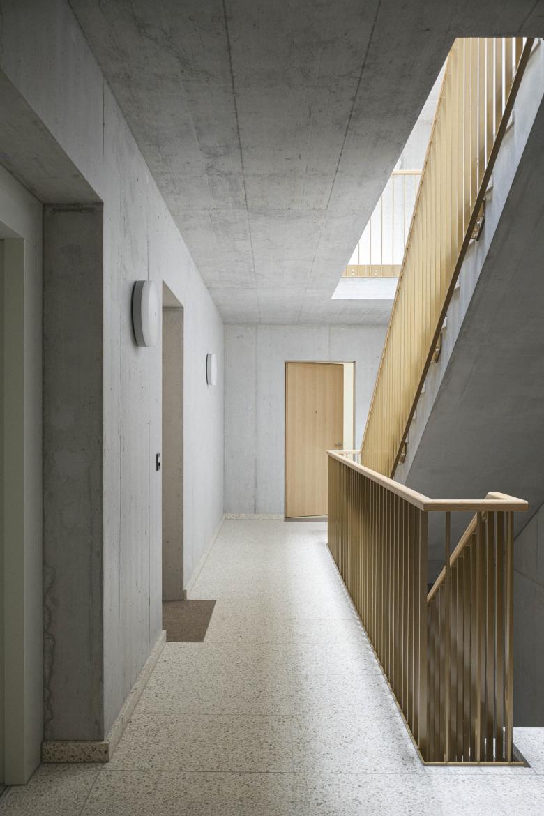 Der Entwurf basiert auf vier ineinander verschmolzenen Quadern, die einen effizienten Fünfspänner bilden. So bietet das Volumen dank Ausnützungsmaximierung grosszügige Wohnungen unterschiedlicher Grösse, wobei wiederkehrende Elemente in Grundriss und Fassade eine Einheit schaffen.
