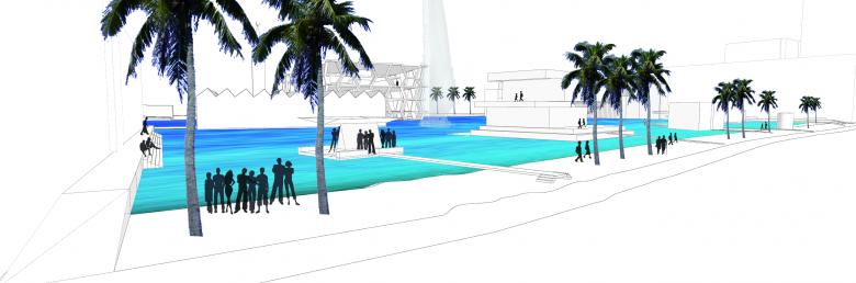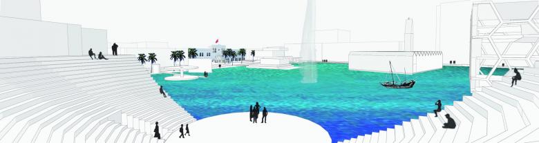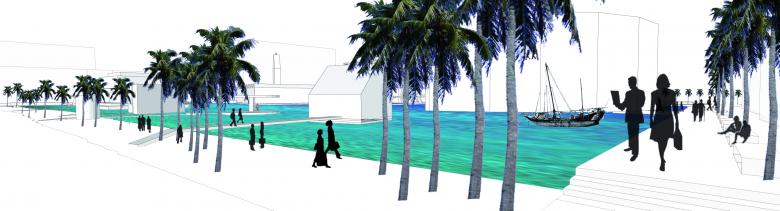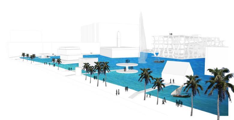 That void is accessible through divers activities like renting boats for sailing, paddling or artificial pearl diving. A tall water fountain (a present from the City of Geneva) is installed in the middle of the water to mark a centre of peace, a strong statement and maybe a reference to the pearl roundabout? A continuing promenade around the water invites people to enjoy this place. The promenade offers a variety of benches, gradients, stairs, ramps and also access to the water. Overall shadow is created with palm trees.