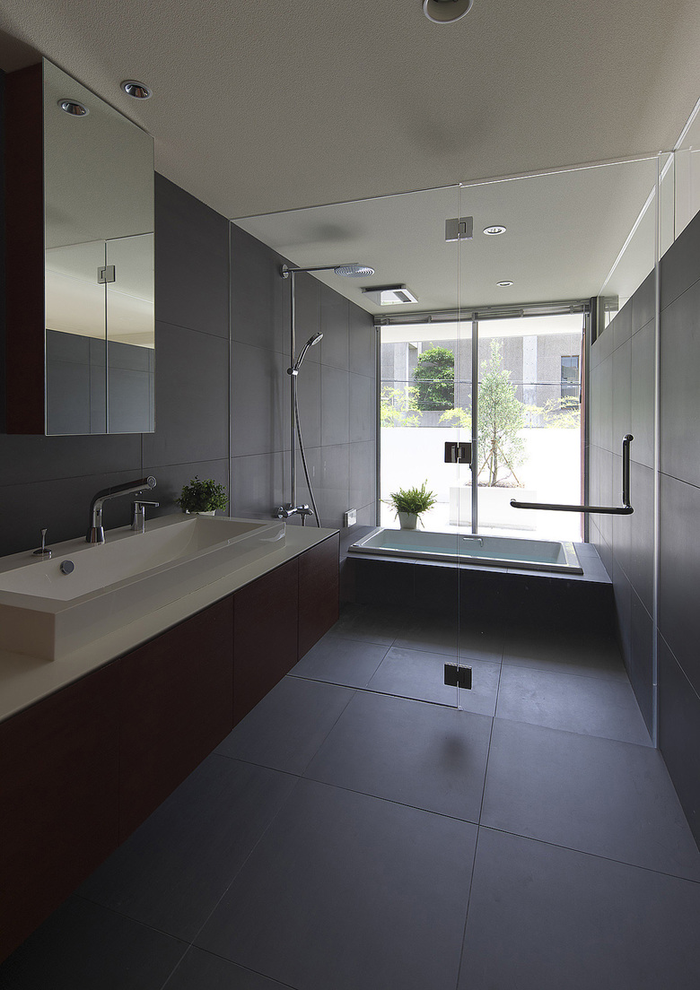 I intended I made the material continue and to make the environment because housing in site north and south was KONKKURITO strike release housing. Cedar mold concrete casting release was adopted as completion of the outward appearance which keeps a balance of ambient surroundings and keeps moderate tension and the Hitoshi opposition situation. The gentleness of the tree and the warmth were added to the surface of the concrete which is to make it cedar mold completion and is mineral matter, and it was considered so that streets weren't a cold impression. The drab of the whole building is lost and the depth and a change are being given by surrounding with outside appearance fence with a white plasterer wall. That changes into universal beauty though it's the outward appearance of the simple rectangle by the harmony with the streets and the trees distributed to a balance right place with a white wall.