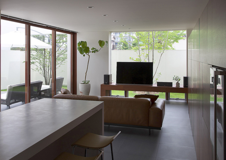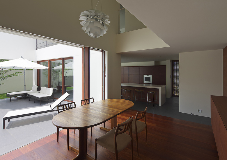 A living room becomes same with a courtyard by making 3 sliding doors in the living room opening, and the look goes to the back stage.A roof part in the parking lot made the level of the loft uses the difference of ups and downs in the sites, and is a stage in the surface of the water where a maple colors. The stage also charged with its role as the equipment to which a change in a look and migration are given spreads over the sky, and the internal space connects to the sky.