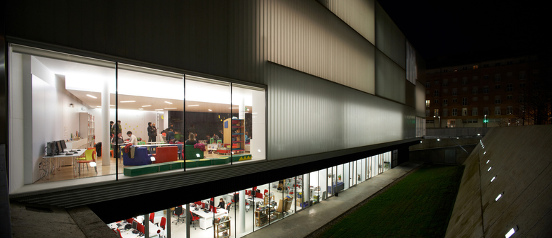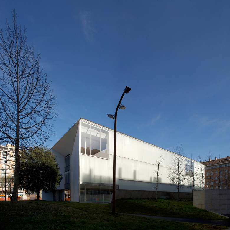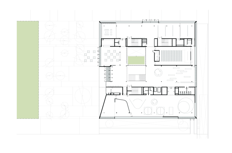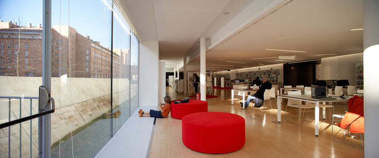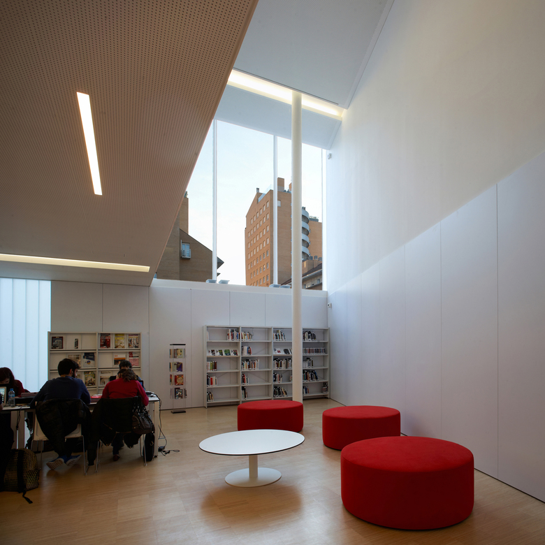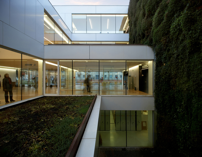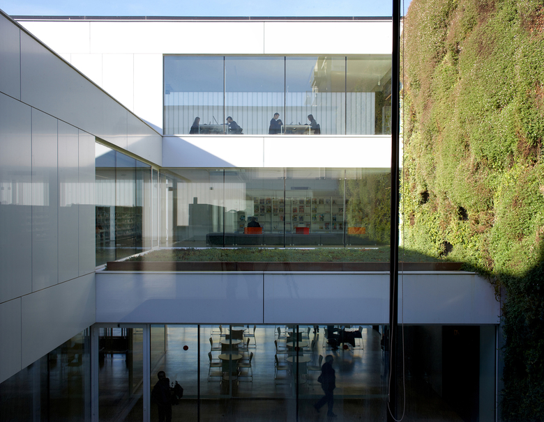 The new library is located on a large rectangular plot in the center of Girona. Bounded on the north by busy Avenue Emili Grahit, the site is embedded in a dense and compact neighborhood of tall residential blocks. These urban conditions – plus the fact that this is the largest library in the network of public libraries in Catalunya – contributed to the development of a design strategy based on two main considerations. First of all, given its civic and cultural importance the decision was made to differentiate the library from the surrounding residential fabric both in terms of its form and the materials. Secondly, while the design responds to the new programmatic challenges of today’s library as a place of social interaction for young and old, it also reclaims the traditional role of the library as a place for reading, study and quiet reflection. The different functional areas have been distributed over the building’s four floors according to the corresponding user groups and activities. Visitors enter from the new public plaza into the open and dynamic ground floor that contains the children’s library and playroom, an auditorium, exhibition gallery, cafeteria, and a place for reading newspapers and viewing videos. On the upper two floors there are the specialized areas of interest and spaces for reading, consultation and investigation. The administration offices are located on the basement level where access is limited to the library personnel. A large open staircase connects the three public levels. In addition to allowing for fluid vertical circulation, the staircase is a key element for understanding the spatial continuity inside the library, which is organized around three internal courtyards. While the transparent glass walls convert all the courtyards into gardens that are extensions of the interior spaces, each one assumes its own identity. The articulation in plan and section of the central courtyard transforms it into a large funnel that brings natural light down into the heart of the building. The exuberant full-height green wall is a backdrop for the sequence of platforms created by the shifting geometry. From a rectangle on the basement level it becomes a square on the ground floor and then a double square on the first floor. On the top floor the patio opens up to become a square four times the size of the ground level. The square courtyard on the south side features a tree in the middle and extends from the first to the second floors. And the third patio is a single-height square on the northeast corner. The principle protagonist of the library is the light in its many variations. The square-shaped volume is almost entirely glazed in U-glass punctuated by sections of transparent glass, flooding the interior with a diffuse light especially comfortable for reading while framing views of the surrounding neighborhood. At night the library glows like a giant urban lantern, welcoming everyone to enter and become part of this place for knowledge, culture and community life.