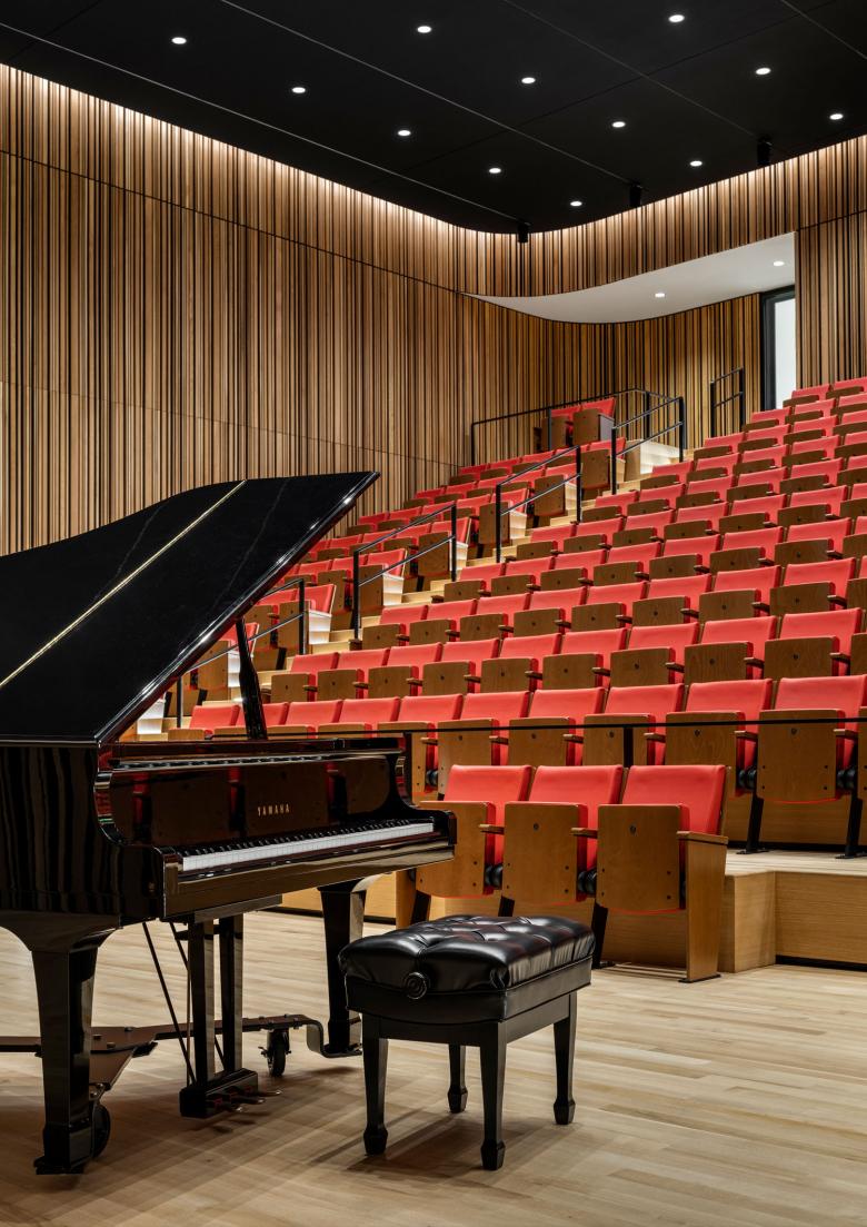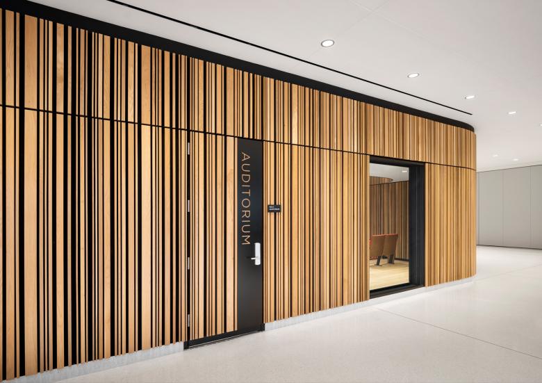 On the third floor, the highlight is the Grand Reading Room. Previously just one floor high, removal of a ceiling now gives it double height, visually connecting into the fourth floor reading room above it. The fourth floor now features a major 291-capacity auditorium. This double-height event space has warm wood-lined walls which curve around the corners, and banked seating which rises into an entirely new fifth floor.