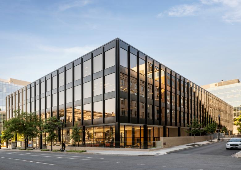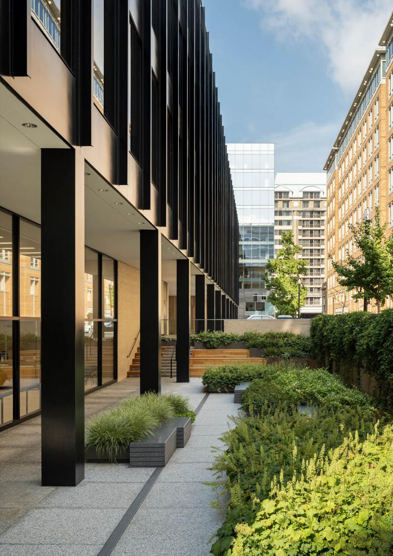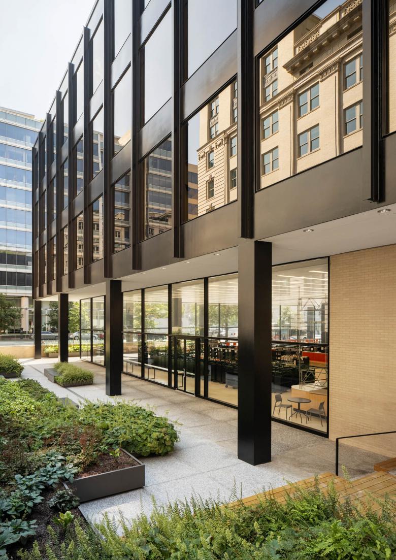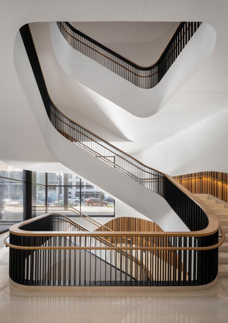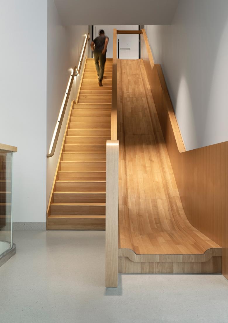 The main G Street entrance leads into the Great Hall, the lobby. The intervention brings warmth and better acoustics to the lobby, and boosts the library’s social dimension from the moment you enter. A new café is partitioned by glass from the Great Hall, and extends to an outside area on the library’s north-east corner. Brick walls have been cut back so that it is open to the sidewalk, connecting the library with the city.Mecanoo has introduced two new wood-lined staircases characterized by their sculptural fluidity. Stairs are wide, terrazzo surfaced and curve up around a middle void from the lower ground floor to a new fifth floor, where natural light falls through circular skylights. The staircases exemplify Mecanoo’s organic styling, bring a soft, sweeping rhythm to vertical circulation, and they act as social connectors.