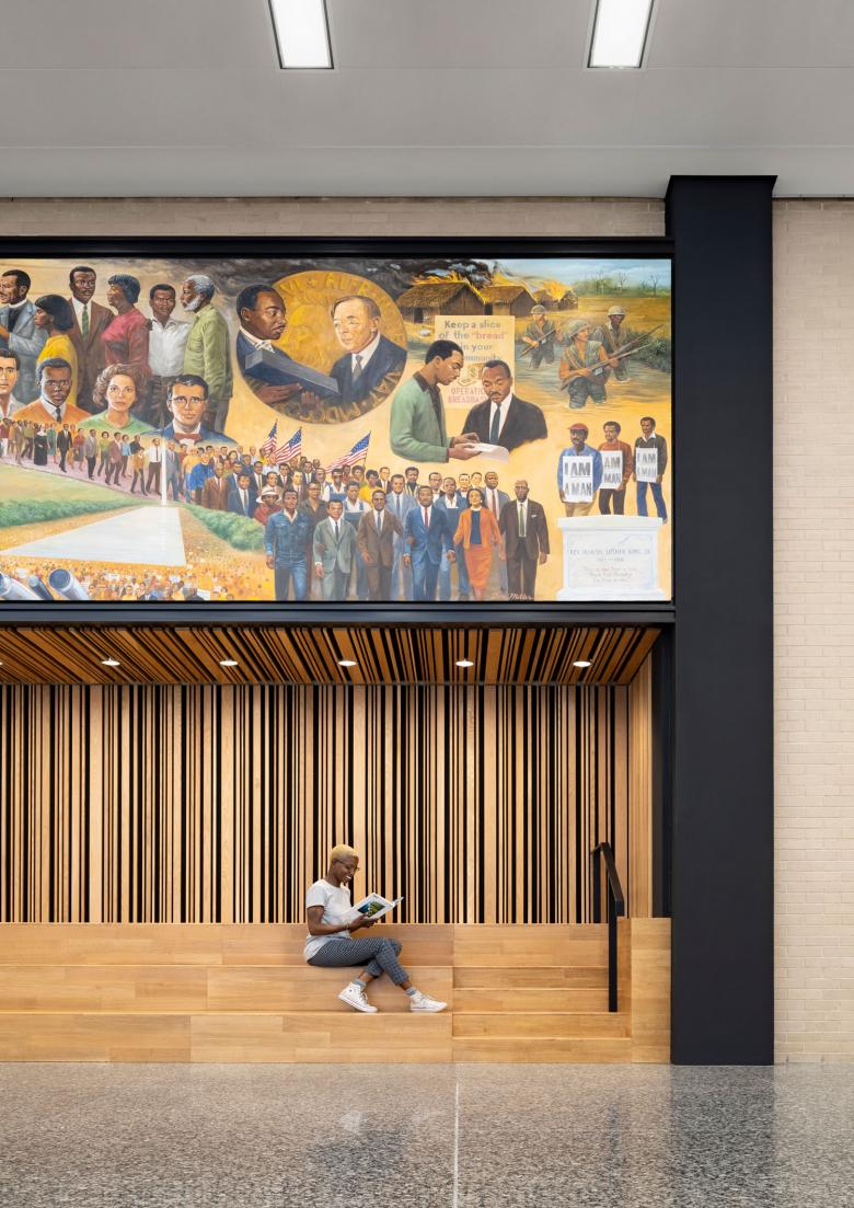 The transformation of MLKL brings a new, humanistic environment at all levels, designed and programmed for the future, and it adds facilities including a public roof garden, a theater, signature staircases and a suite of community studios and workshops. The library, which opened in 1972, is reborn as a contemporary lifelong-learning hub which reaches out to all communities.