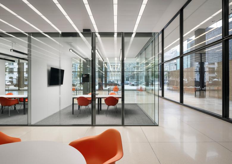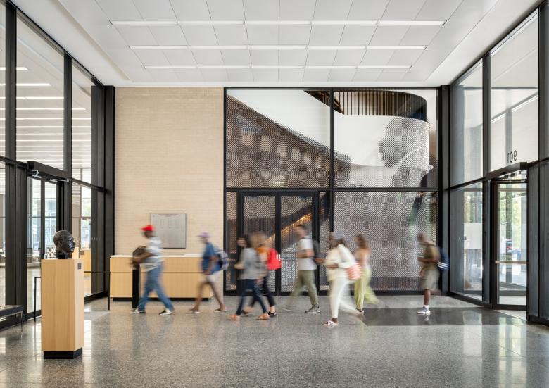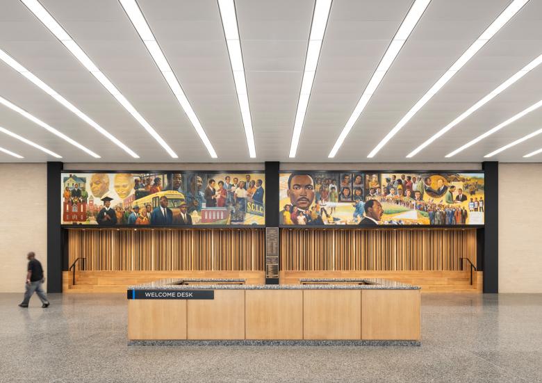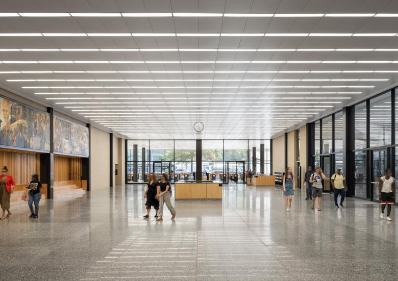 It was the only library designed by Ludwig Mies van der Rohe, one of the twentieth century’s greatest architects, and was subsequently named after Dr. King, the towering civil rights leader who was assassinated in 1968. The 39,600 m2 rejuvenation project respects the powerful simplicity of the original building. The MLKL’s rectangular form has three glazed floors which float above a first (ground) floor recessed behind a colonnade of black steel columns.