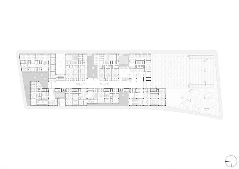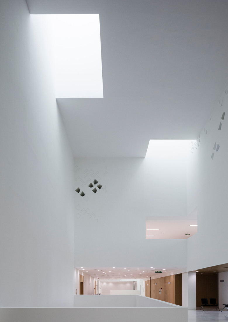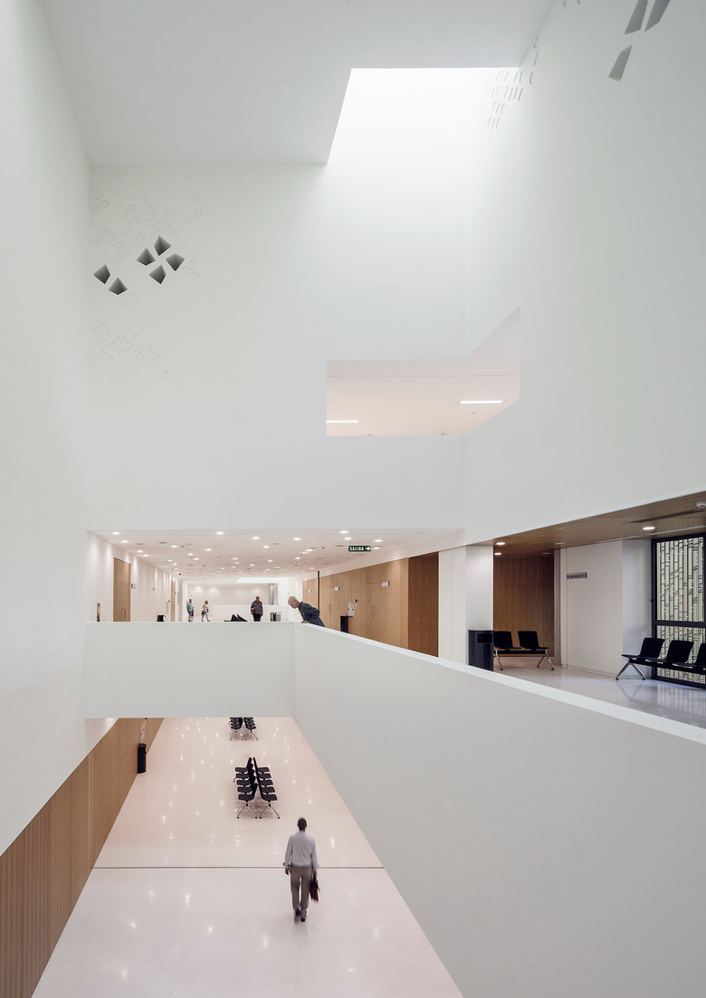 The addition of a public institution to the area creates the opportunity to upgrade the public realm and add a civic quality to this relatively new neighborhood. The massing strategy creates urban integration through fragmentation. It follows a similar strategy to the spontaneous growth process of medieval cities resulting in a volume which is carefully sculpted to adapt to the surrounding context.From the main entrance, the interior organization is easily recognizable. A central spine creates a circulation axis which connects to the various the programs of the building. This space spans through several floors across the length of the building and articulates each department. It also links the public circulation with the exterior patios. The spine echoes the architectural language of the exterior massing, with multi-level day-lit voids creating sculptural atriums throughout the building.