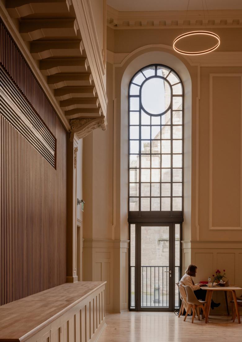 The transformation of the former Lesser Hall into a dynamic communal space, complete with a café and event venue, stands as a testament to our commitment to functionality and inclusivity, serving not only visitors but also local inhabitants. By lowering the windows to the floor level, we invite natural light and panoramic views of St. Johns Kirk into the once-introverted space, thereby transforming it into a vibrant hub for community engagement.