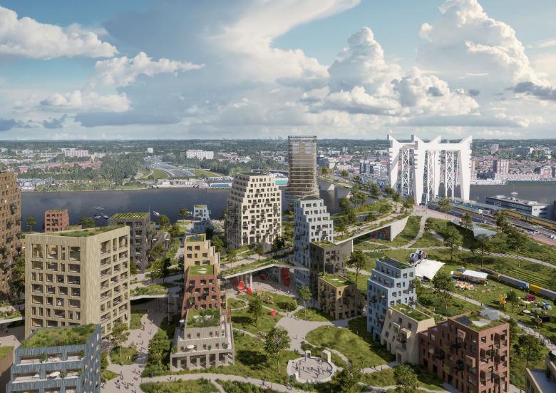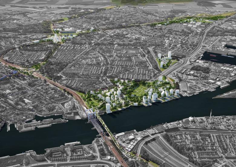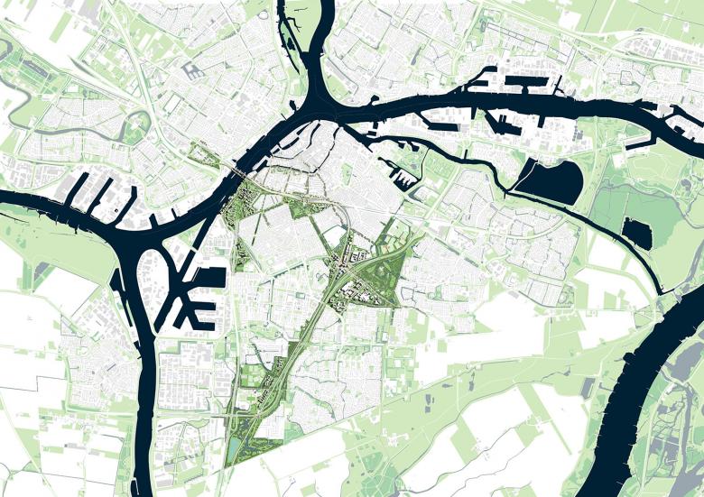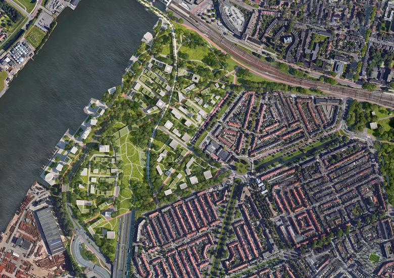 The area around the railway is easily accessible and is within close vicinity to amenities, the historic city centre, the river and the countryside. The vision builds on the beauty of the oldest city in Holland, the nature of the Dutch Delta, but also raw elements such as infrastructure, railways and industry. Places that are loved and places that are disliked will form an attractively coherent whole in 2040.In the vision, the Stadsbrug transforms from a motorway into a high-level green city park. Here you can walk and cycle between the new residential buildings along the river front with a view of the Oude Maas river and the city. The green estate of Weizigtpark connects across the railway, enabling access into the city centre through the greenery. Dordrecht Central Station will be the greenest station in the Netherlands and on the Oude Maas river people will live 'with their feet on the water' in a car-free neighbourhood.