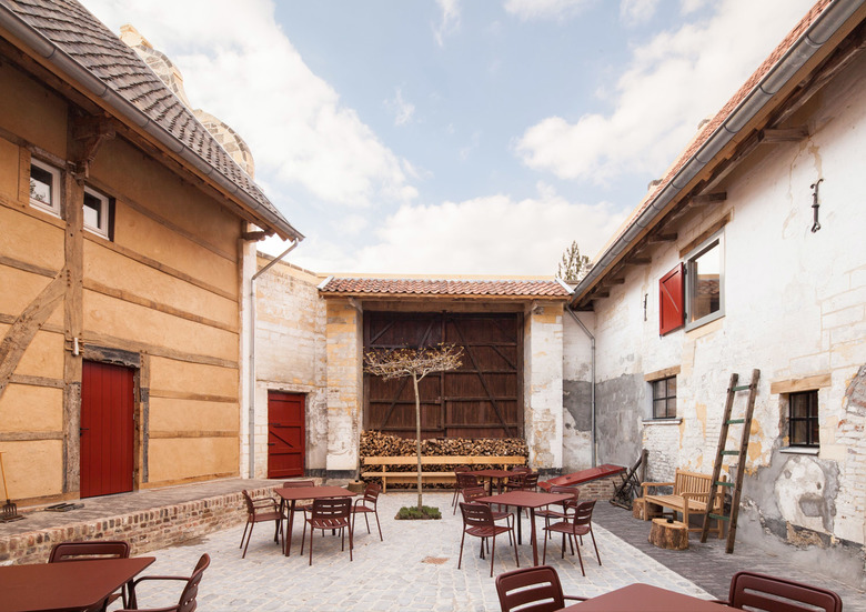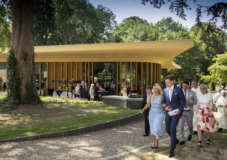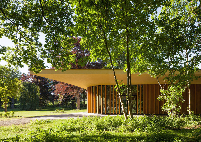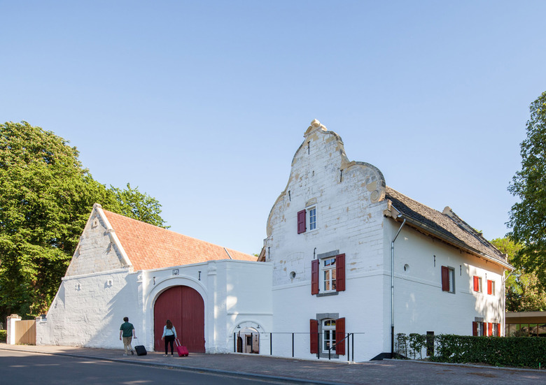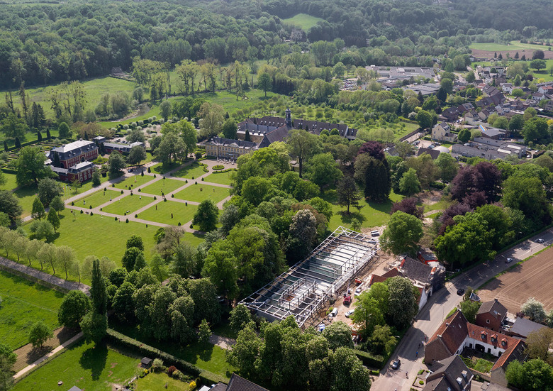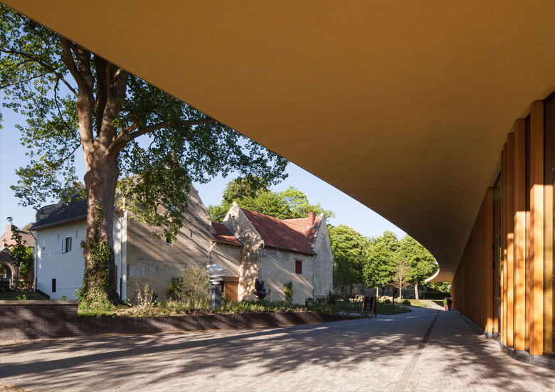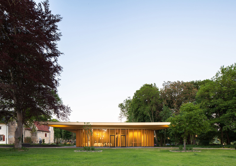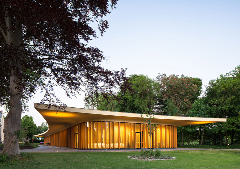 The pavilion completes the ensemble of the Château (1661), the St. Gerlachus Church (1727), the Farmstead (1759) and the Manor Farm (1668). The estate is now clearly visible from the public road, and has gained new significance for the village of Houthem.The transparent, state of the art pavilion features three large multifunctional meeting rooms under a cantilevered roof with a beautiful curve. From the pavilion, guests will have views over the château, the hills, the meadow and the manor farm. The materials used are inspired by the natural surroundings of Limburg: marlstone, bluestone and oak.