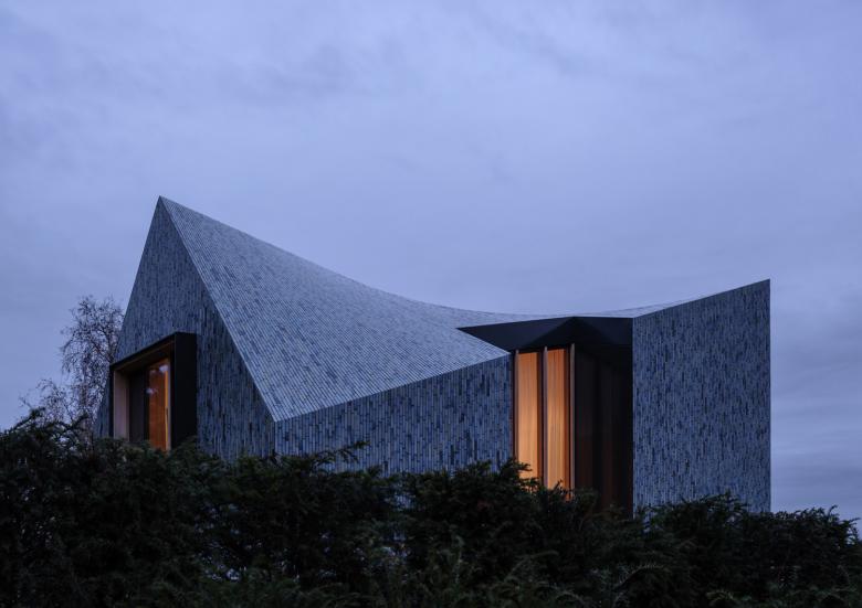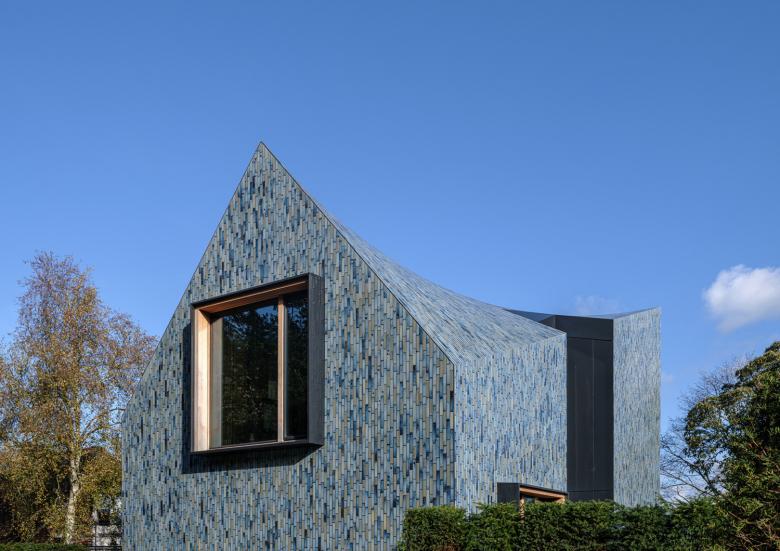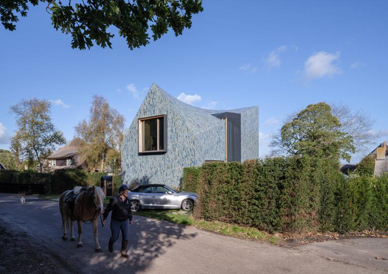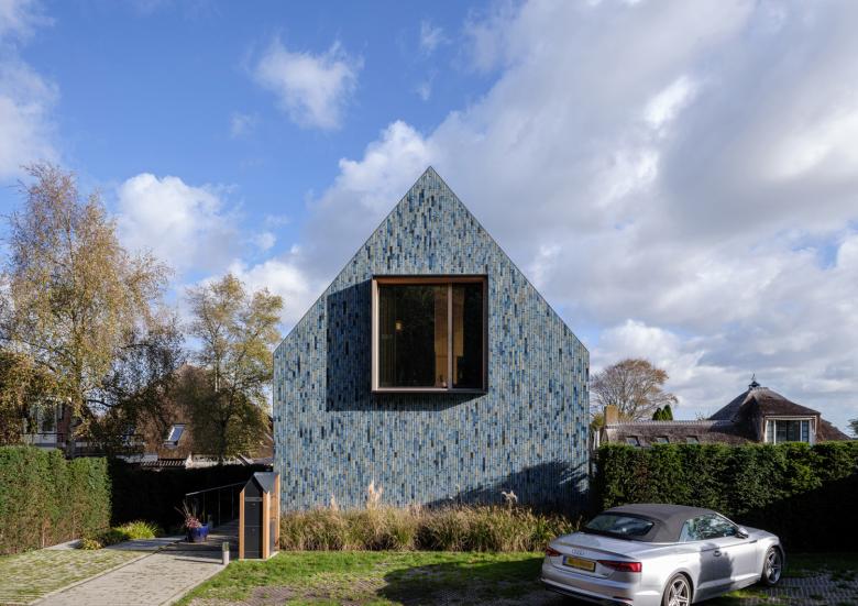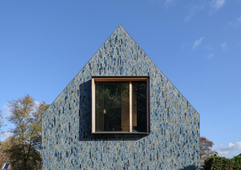 The strong connection between the landscape and the house translates into the expression of the facade and roof cladding with the application of a single natural material, expressed through a custom ceramic tile covering that wraps the entire building. This customised multicoloured glazed tile cladding represents the transitions in the landscape, from dune landscape to polder, and the soil layers, from light to dark.