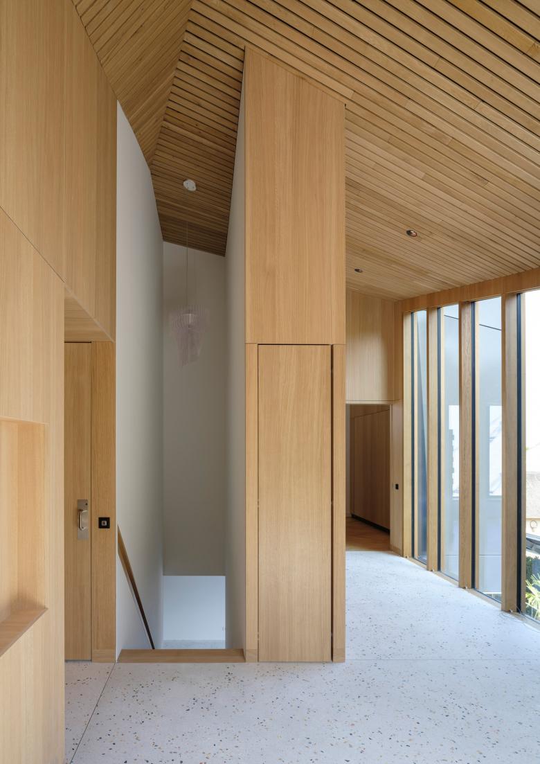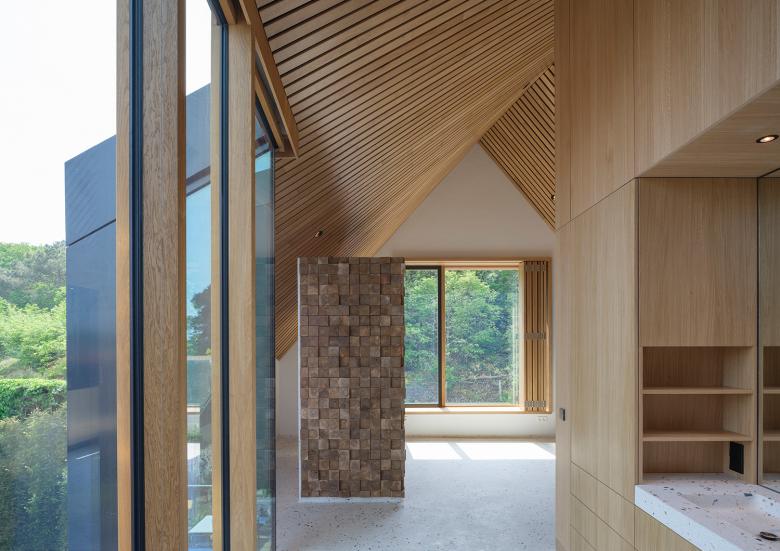 In the interior, all living spaces are organised around the curtain wall-enclosed voids and an enclosed wood-cladded core. The curtain wall provides transparency and daylight down to the basement levels. The enclosed element-feature of the interior from the basement to the hood of the building accommodates supporting functions. The interior design is completed by beautifully framed views of the surrounding countryside, utilising wooden frames passing through the traditional tile work.