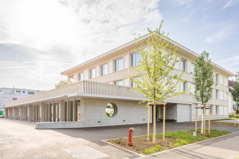Das Wohn- und Atelierhaus «Romeo» verbindet sich mit dem bestehenden Wohnheim zu einem kleinen Dorf im Dorf. Der dreigeschossige Neubau erweitert das Angebot der Stiftung um fünf Wohngruppen für insgesamt 26 Bewohner*innen und beherbergt 22 Arbeitsplätze im Atelierflügel. In geschützter Umgebung können sich die Bewohner*innen zurückziehen, zusammen arbeiten, gemeinsam ausruhen und feiern oder durch die abwechslungsreichen Innen- und Aussenräume flanieren.