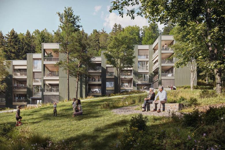 Die Naturräume am Nussbaumerberg sind einzigartig: eine Landschaft am Waldrand – hügelig und grosszügig –, mit einer ganz besonderen Vegetation, in der die Geschichte des ehemaligen Gärtnereiareals Häfelerhau nachklingt. Die langgezogenen Wohnbauten schieben sich zwischen die Ausläufer des Waldes und vermitteln mit ihren grün schimmernden Fassaden als Form- und Farbverwandte zwischen Waldhorizont und heterogen bebautem Dorfrand. Sie formulieren einen ebenso markanten wie fein kalibrierten Auftakt zum Siedlungsgebiet.