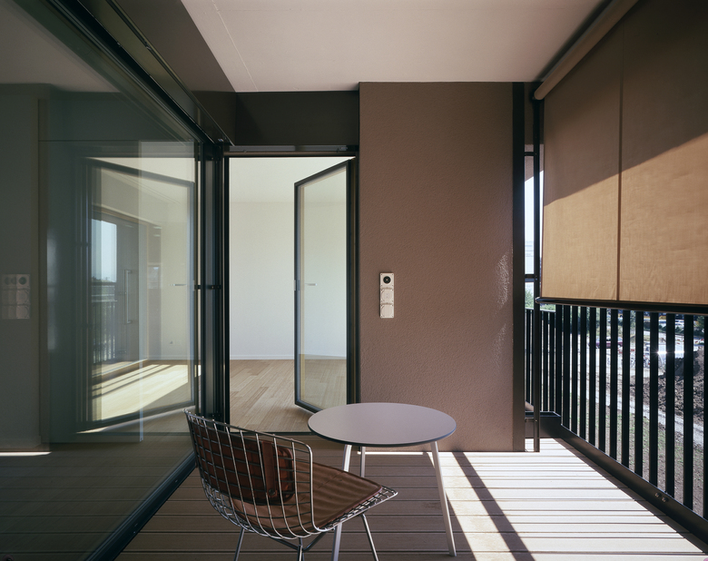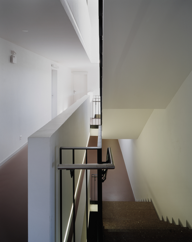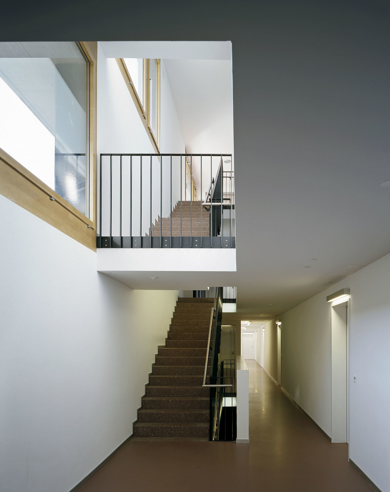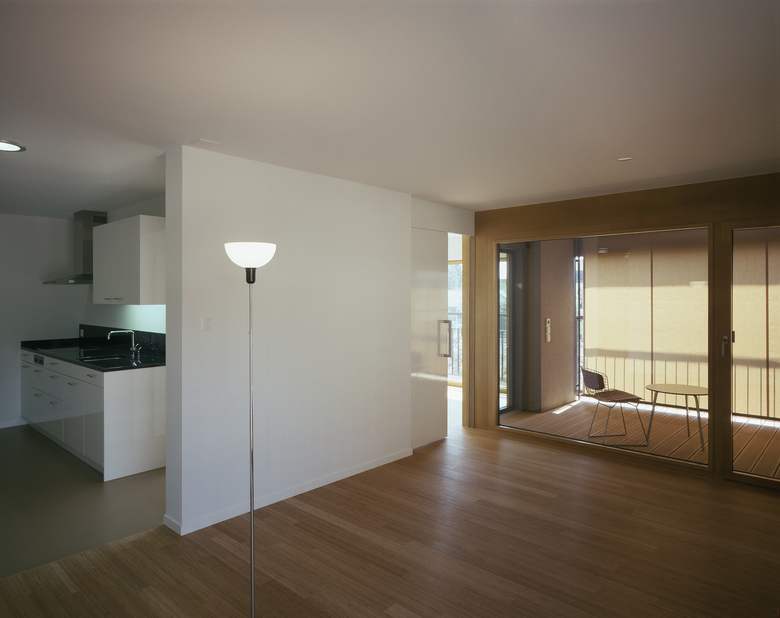Die 18 Alterswohnungen sind einbündig organsiert und alle hangabwärts nach Südwesten orientiert. Der Aussenraum ist eine eingezogene Loggia. Die Erschliessung ist grosszügig und lässt Nischen offen, die als gemeinsame Sitzzonen genutzt werden können. Das Haus ist mit einem geschlossenen Korridor mit dem Pflegeheim verbunden.