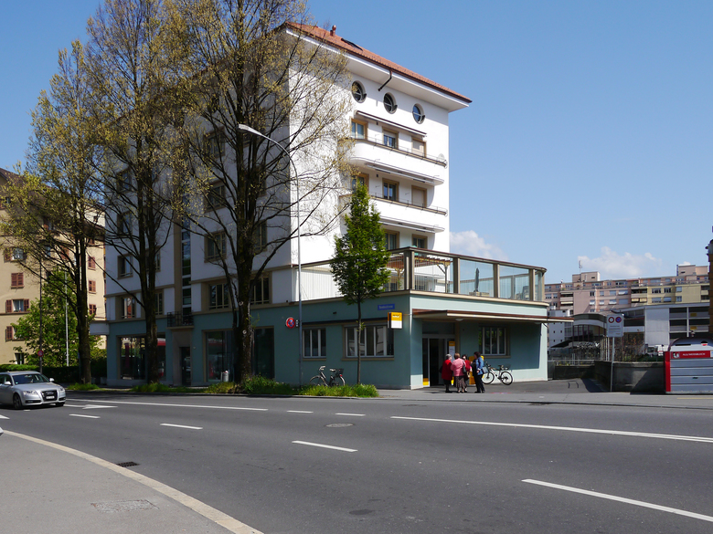 Das Gebäude in der Bundesstrasse 10 wurde 1932 vom Luganeser Architekt Augusto Guidini geplant. Das Gebäude wurde als Kopfbau der weiteren Häuserzeile in der Chlaridenstrasse erstellt. Im Erdgeschoss wurde 1933 ein eingeschossiger Anbau für die Post realisiert; 1949 wurde die Post durch den Einbezug zweier Verkaufsräume erweitert. Hierbei wurde die Eingangssituation verändert, anstelle der Schaufensters entstand die Eingangsfront mit den Postfächern und den Telefonzellen, die den Eingang zum Schalterraum bildeten. 1959 wurde Flachdachgebäude mit einem Walmdach überdeckt.