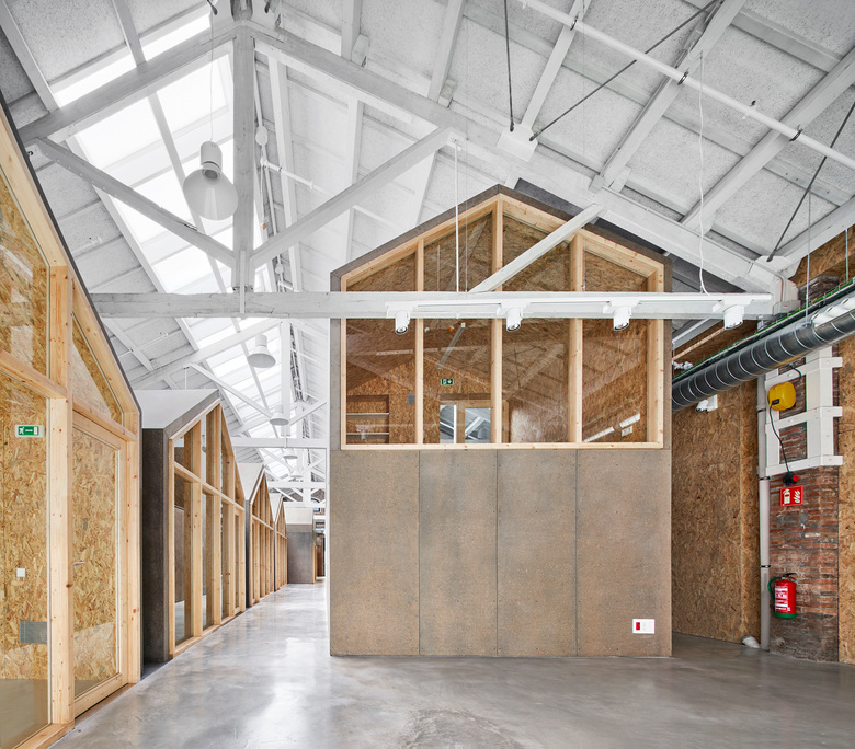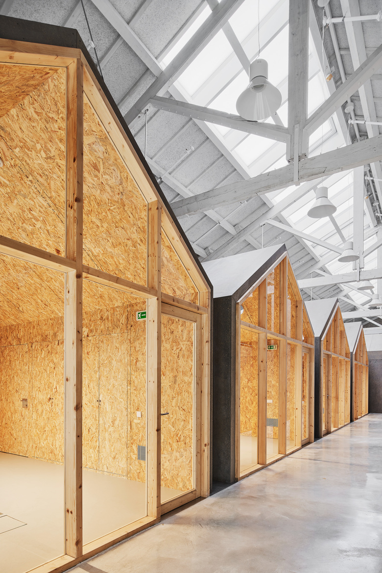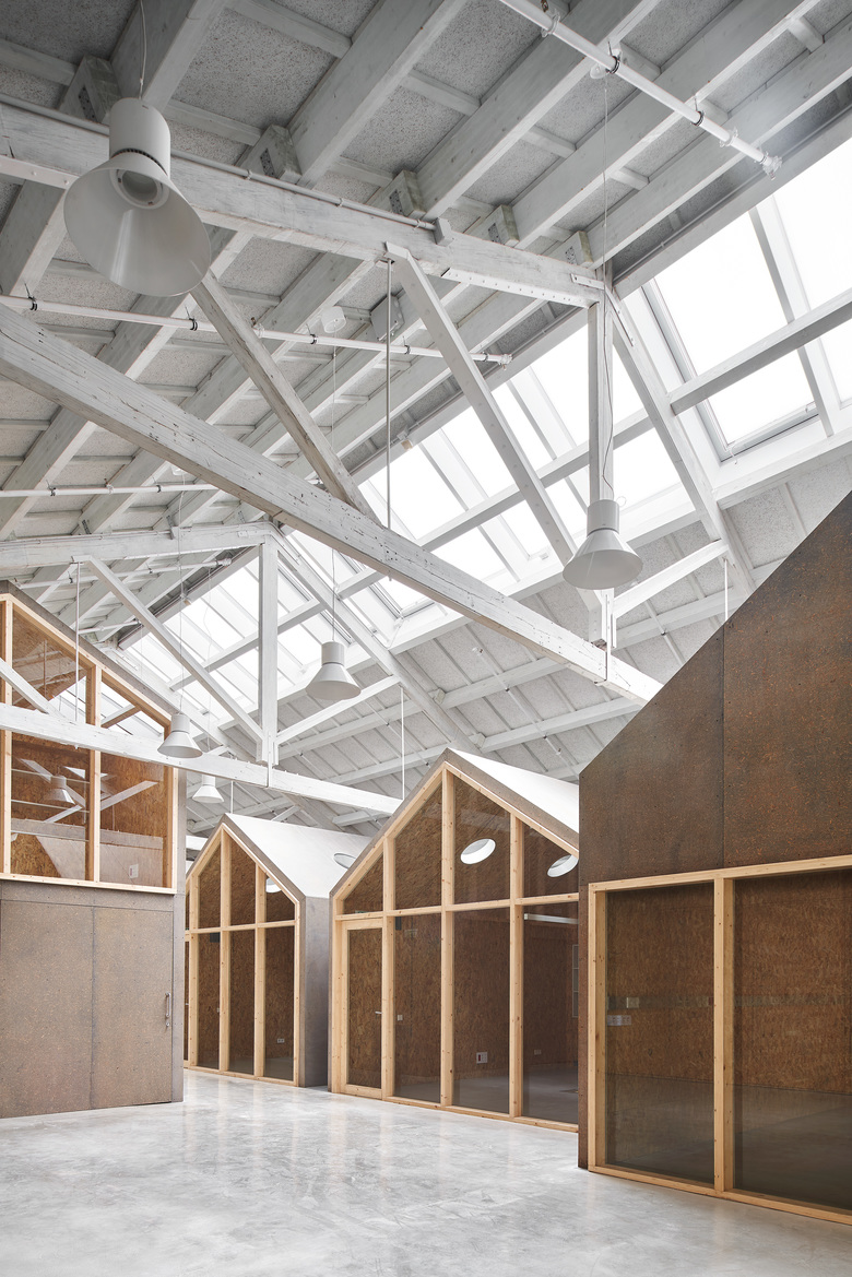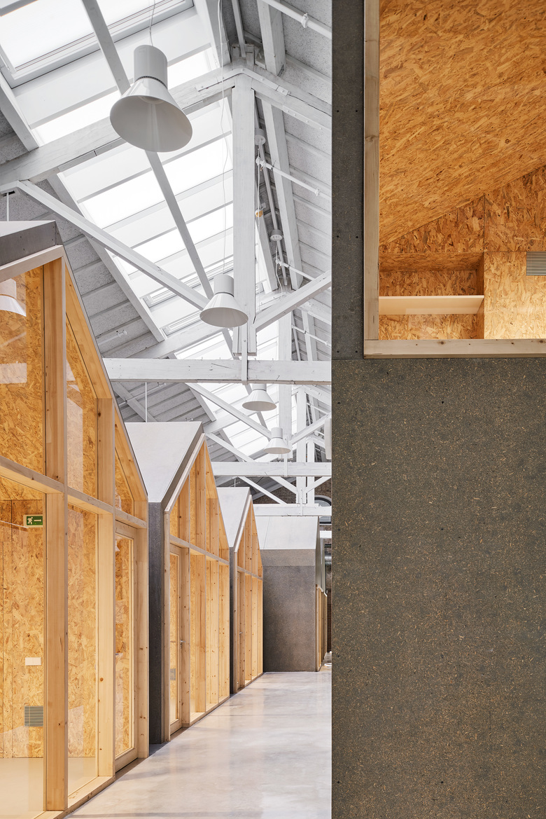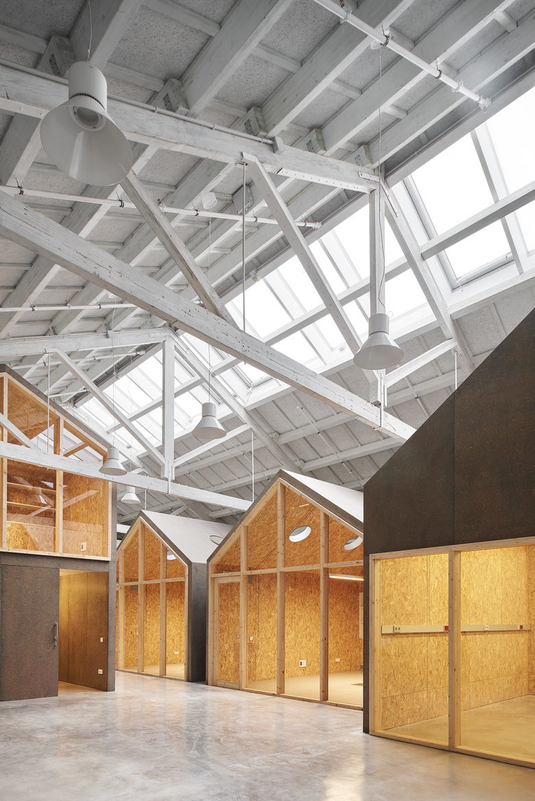 This "Box in box" strategy, through modules that do not contact the main space roof, allows the perception of the entire space of the old warehouse and the clean vision of the pre-existing timber structure. The geometry of the modules in the manner of a “cottage” recalls that of the main building and enriches the interior experience, adding breadth and quality to the work spaces. Inside the modules, some skylights allow the vision of the old roof and the entrance of natural light.