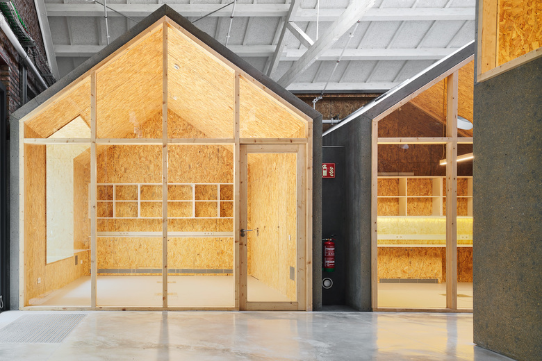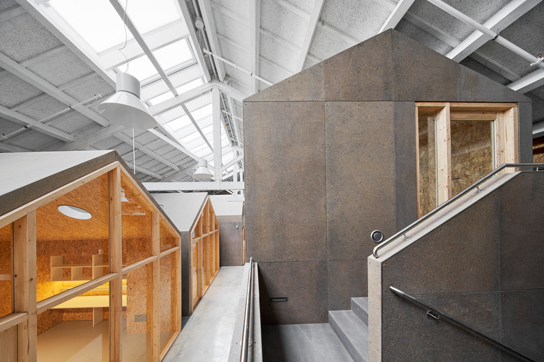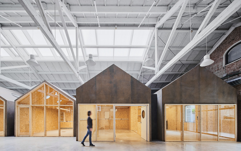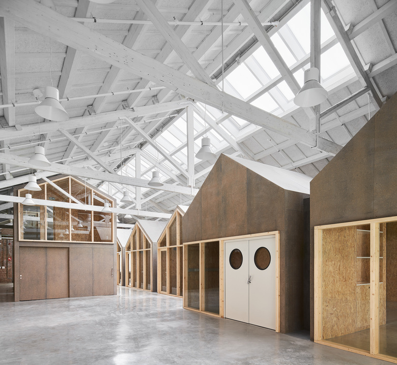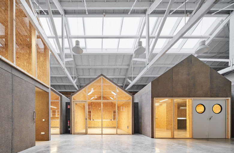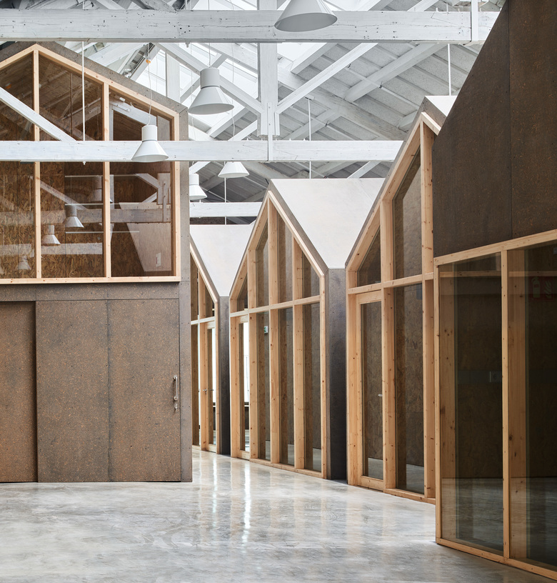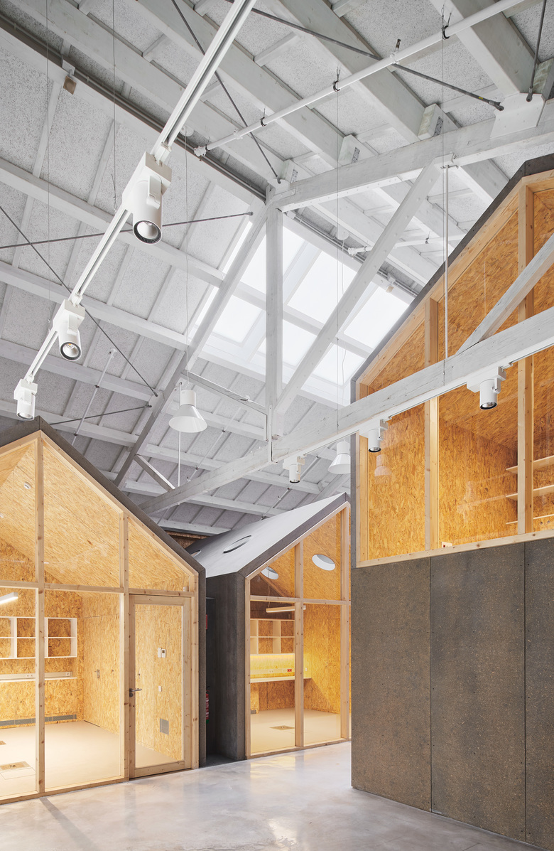 This "Box in box" strategy, through modules that do not contact the main space roof, allows the perception of the entire space of the old warehouse and the clean vision of the pre-existing timber structure. The geometry of the modules in the manner of a “cottage” recalls that of the main building and enriches the interior experience, adding breadth and quality to the work spaces. Inside the modules, some skylights allow the vision of the old roof and the entrance of natural light.