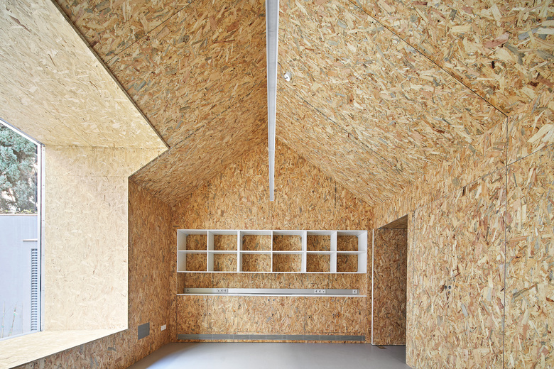The use of wood provides warmth while establishing a dialogue with the concepts Fab Lab and DIY (Do It Yourself). Oriented chipboards (OSB) have been used for the interior coating of the modules. For the exterior, wood / cement particleboard panels in black with a sanding finish have been chosen, seeking the contrast with the predominant white in the rest of the space.