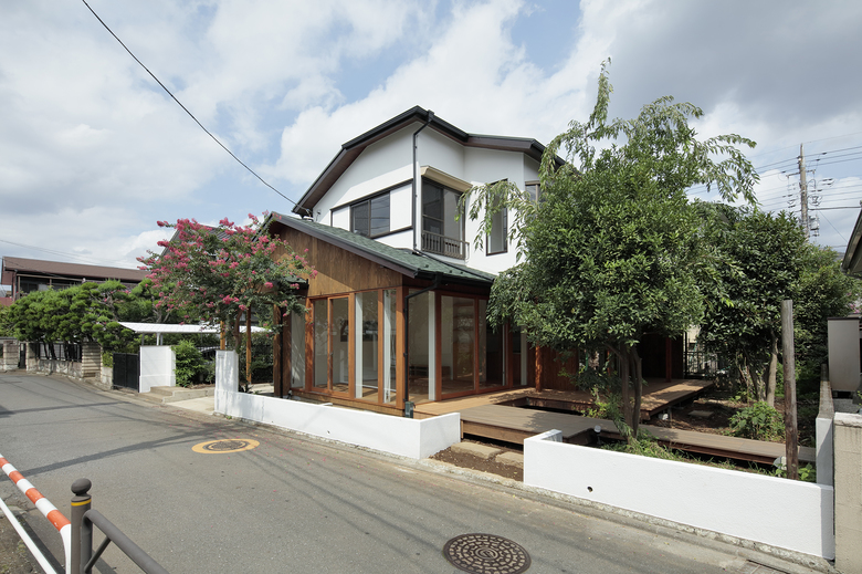 築50年の木造住宅の改修。「プライバシー感(天気や気分によって変わる心のセキュリティ度合い)」を設計テーマに、ITセキュリティを研究する施主と協働した、個人住宅と社会の繋がり方を実験できる住宅です。気分に応じて日常生活を閉じたり開いたりと、住宅がもっとまちとの境界を超えていけるように、生活の丁寧な観察をし、その生活が外側へ拡張されるよう外部化する改修設計を試みました。今まで隠れていた日常がまちから見えることで、<まちに暮らす>という偶然性を取込んだ新しい一軒家暮らしの楽しさが生まれることを期待しています。