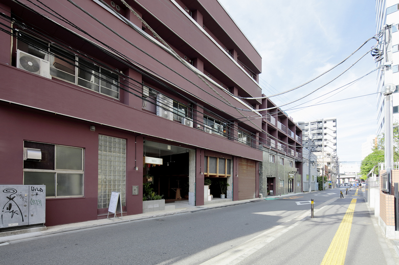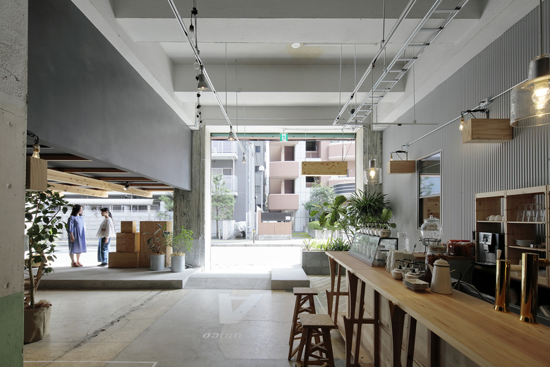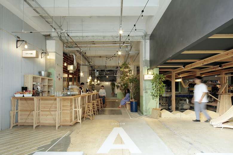 築53年の元工場の改修。かつて生産の町であった工場街に、fab工房をベースとする生産と消費を内包した創造複合拠点として計画しました。1階に入居するfab工房と共同し、工房で木材を切り出せるサイズに全体の設計をアジャストし、施設内の内装から扉、屋台や家具に至るまで制作しました。全体は5階建で、内外が地続きとなった1階にはオープンカフェ、3・4階には、スモールオフィスの複合するシェアワーキングスペースが入っています。共有部や木のコンテンツの作り方により、使い手が使い方を自由に発見し続けられるような、大らかな環境となりました。