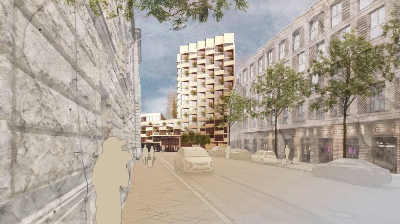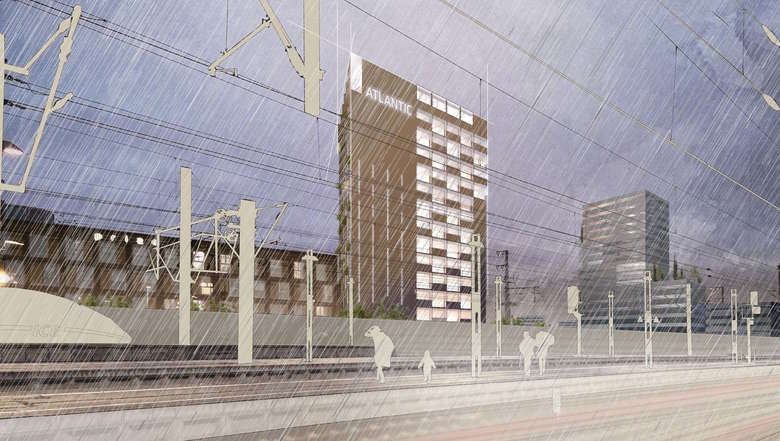 STÄDTEBAU UND FUNKTION – Die Baukörperskulpturen bewirken neben der eigenen Baumassengliederung zugunsten eines möglichst schlanken Erscheinungsbildes Stadtraumbildung. Der Tower Atlantic-Hotel vervollständigt mit dem Kopfbau gen Norden einen Wegestern als Auftakt zum Brückenschlag über den Flutgraben. Dabei rahmt die Westseite den neuen Stadtplatz und gleichzeitig weist die Kerbe auf den Haupteingang des neuen Hotels hin. Ein großzügiges Vordach verschafft zusätzliche Aufmerksamkeit und Aufenthaltsqualität in diesem Bereich.