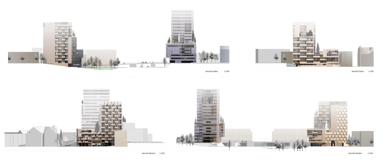 In diesem Verständnis wurden zum einen Baukörperskulpturen geformt, die den Maßstab der unmittelbaren Umgebung (Traufhöhe, Firsthöhe, Fassadenlängen etc.…) aufnehmen, durch Kerbung den aufsitzenden Turm möglichst überhöhen bzw. durch Stufungen eine Verschlankung des Turms bewirken. Zum anderen bestand die Absicht Attribute der Stadt zu materialisieren … in Form zu bringen.