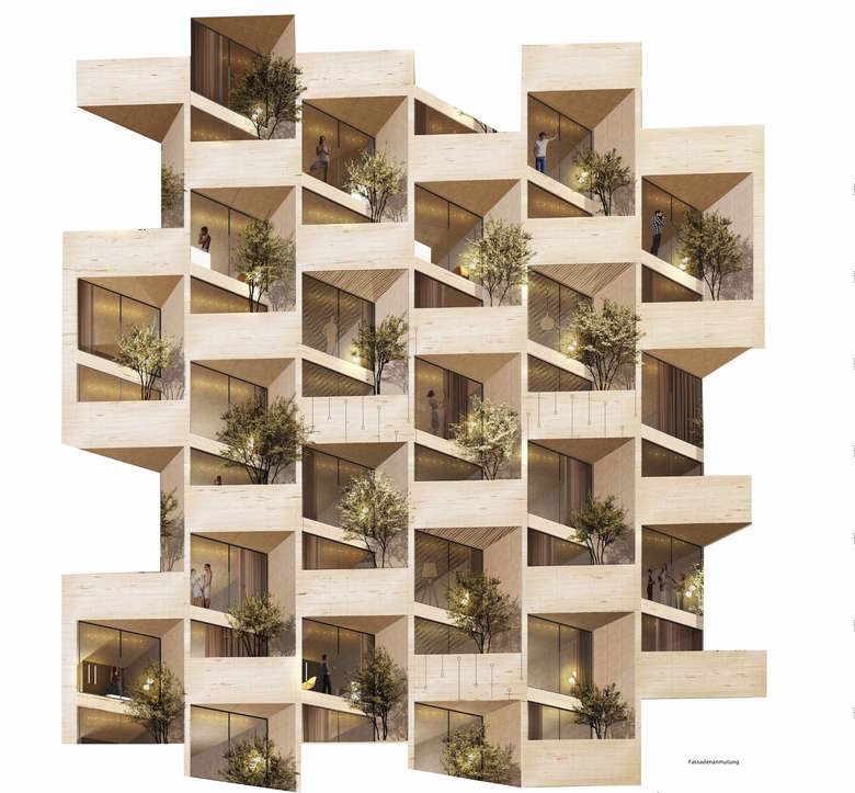 Das vorgeschlagene Material aus scharriertem bzw. gebürstetem Kalkstein kann als Leichtbausystem auch bei Hochhäusern sehr effizient Anwendung finden, wobei gleichzeitig ein hochwertiges wie beständiges Erscheinungsbild erzeugt wird. Die Kombination des regionalen Steins mit dem lichten Grün der einheimischen Felsenbirnen und Gräser schafft den Brückenschlag zum bekannten landschaftlichen Motiv. Gleichzeitig werden durch die Begrünung positive Effekte für ein frisches Mikroklima sowie für Aufenthaltsqualitäten geschaffen. Nicht zuletzt bewirkt die Zusammenfassung je zweier Zimmer über zwei Geschosse einen vertrauten Maßstab - sinnbildlich ähnlich dem Haus mit Vorgarten oder der Bienenwabe … Entscheidend ist hierbei die Wirkung kontra Anonymität und pro Wohlfühlfaktor - mit dem Anspruch auf ein „Zuhause auf Zeit“. Das Gesamtgebäude erlangt auf diese Weise einen ganz unverwechselbaren Charakter.