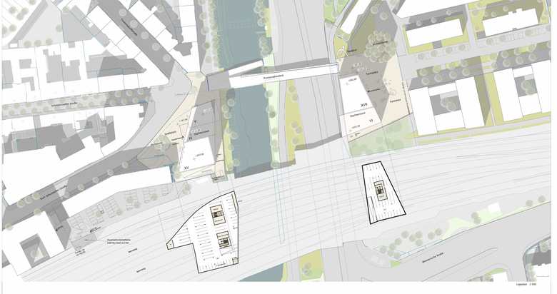 Die Auskragungen beider Baukörper erweitern das jeweilige Flächenangebot und bewirken in Ergänzung mit den parallelen Bebauungen am Bahndamm die Torwirkung in Nord-Süd-Richtung.