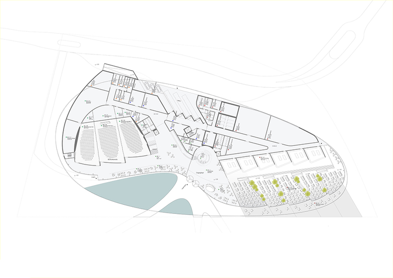 Das Gebäude ist demonstrativ simpel organisiert: Der genannte Eingangsbereich ist mittig, gegenüber des Office Southeast, im Osten situiert. Die gesamte Anlieferung (eingehaust) mit funktionaler Schiene im Westen am Olympiaring. Der Konferenzbereich links vom Eingang im Süden, da von dort auch extern erschließbar. Der Food Court rechts vom Eingang nach Norden, um den landschaftlichen Bezug zum Campus der WOS aufnehmen zu können.