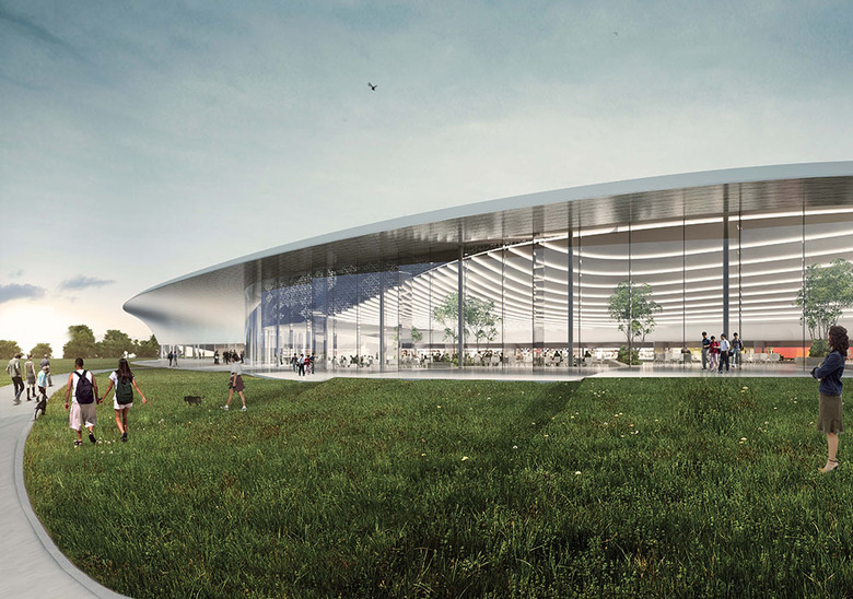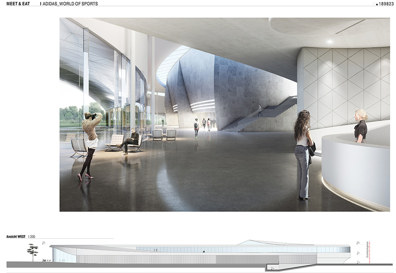 Beide Funktionen sind einer großen elliptischen Dach-Figur eingeschrieben. So wird die Singularität des Gebäudes unterstrichen, das als pavillonartige Landmark einen weiteren autonomen Baustein am Campus der World of Sports darstellt. Insbesondere wirkmächtig ist diese Form gegenüber dem Baukörper des zukünftigen Office Southeast, da nur mit dieser Gestalt das Entstehen eines straßen- und korridorartigen Raumes zwischen den beiden vermieden, sondern im Gegenteil das Fließen des Landschaftsraums forciert wird.