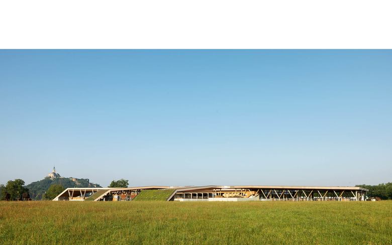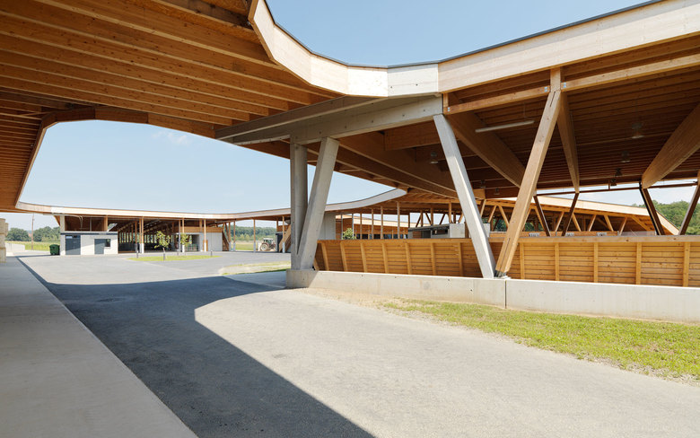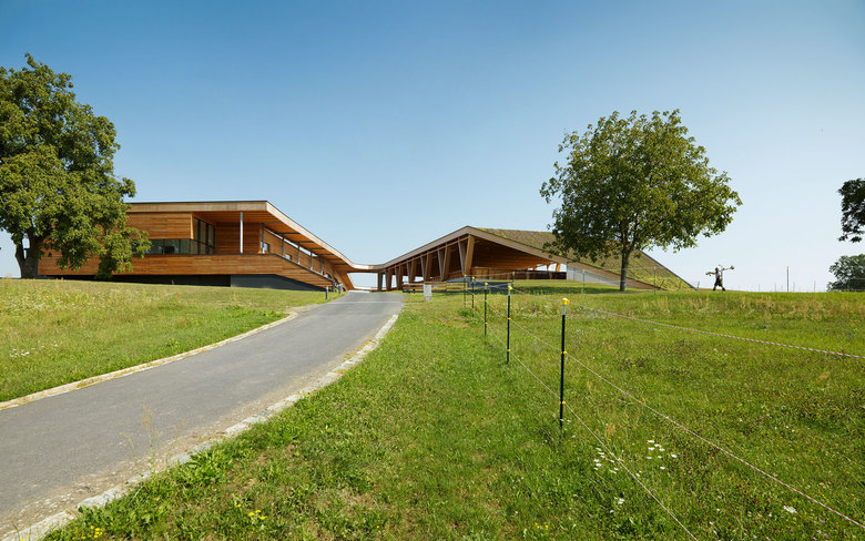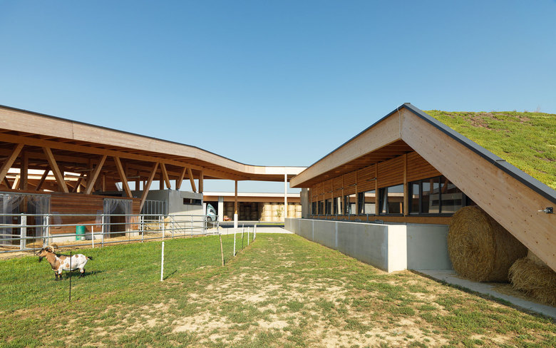 Die Ställe strecken sich locker wie Finger in die umgebende Landschaft. Die Anlage erscheint eher als ein Cluster, denn als vierkanthofartiges Bollwerk. Bewusst werden die Bauten als Teile des Landschaftlichen gesehen, die sich aus den umgebenden Wiesen herausfalten und deren Dächer quasi als hochgestelzte Grasnarben in Erscheinung treten. Das Ganze ist ein locker gestreuter LANDwirtschaftsbetrieb und keine kompakte Industrieanlage.