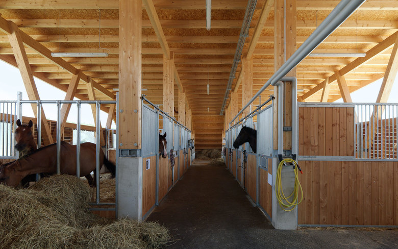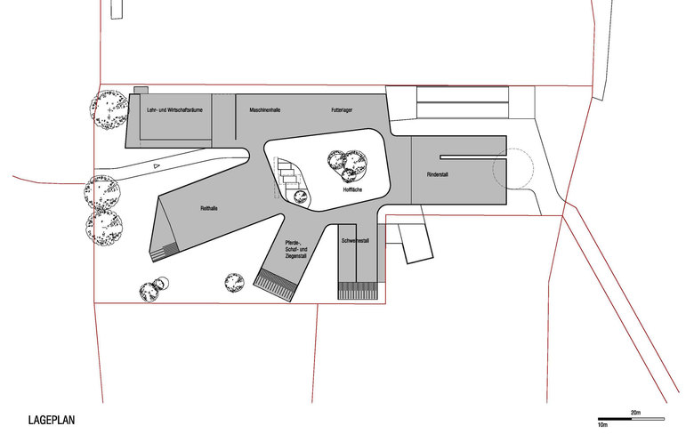 Die Stallanlagen werden um einen zentralen Hof herum angeordnet. Dies bewirkt einerseits kurze Wege und Übersichtlichkeit von jedem Punkt des Hofes aus. Für die Mitarbeiter ist hohe Effizienz in der Bewerkstelligung der täglichen Arbeiten gewährleistet. Über ein umlaufendes Vordach können witterungsgeschützt alle Teile erreicht werden. Die Ställe greifen radial in die Umgebung und werden von Freiräumen, Luft und Sonne umspielt. Somit wird den Tieren genügend Außenraumbezug verschafft. Nach Nordwesten hin bildet der Wirtschaftstrakt einen witterungsschützenden Abschluss. Der Lehrtrakt bildet den Beginn der Anlage von der Stremtalstraße her. Hier ist auch die Reithalle als der am ehesten öffentlich zugänglichen Teil des Ensembles angeordnet.