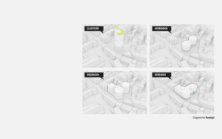 Was geschieht nun, wenn wir zwei dieser Clustertürme als Nachbarn nebeneinander situieren? Zwischen den beiden entwickeln sich räumlich komplexe Verbindungsflächen mit Aufenthaltsqualitäten, wie gefordert, jeweils mit Lufträumen entweder zur darunter oder darüber liegenden Ebene hin.