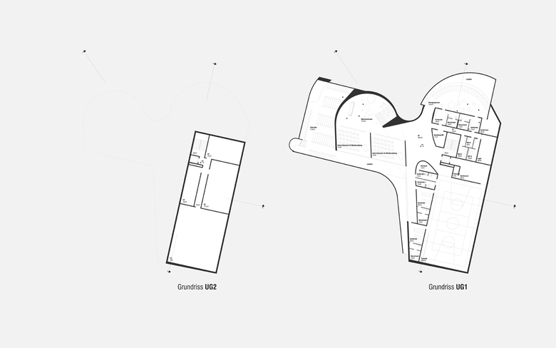 Die weiteren Cluster für Kunst, Naturwissenschaften, Sport und Musik werden ebenfalls gestapelt, und zwar im verbleibenden Raum bis zur Brandwand der Nachbarbebauung. Bewusst wird jedoch von der Baulinie an der Sillgasse zurückgewichen, um den engen Straßenraum zu verbreitern und einen vom Verkehr geschützten Gehsteig zu schaffen. PassantInnen können auf ihrem Weg in einen der Turnsäle blicken.