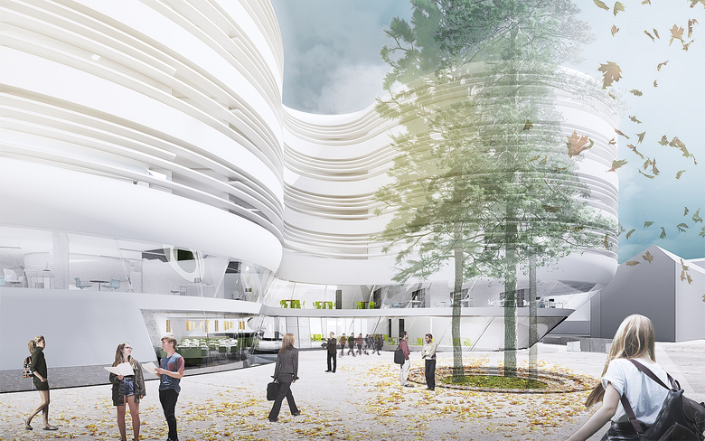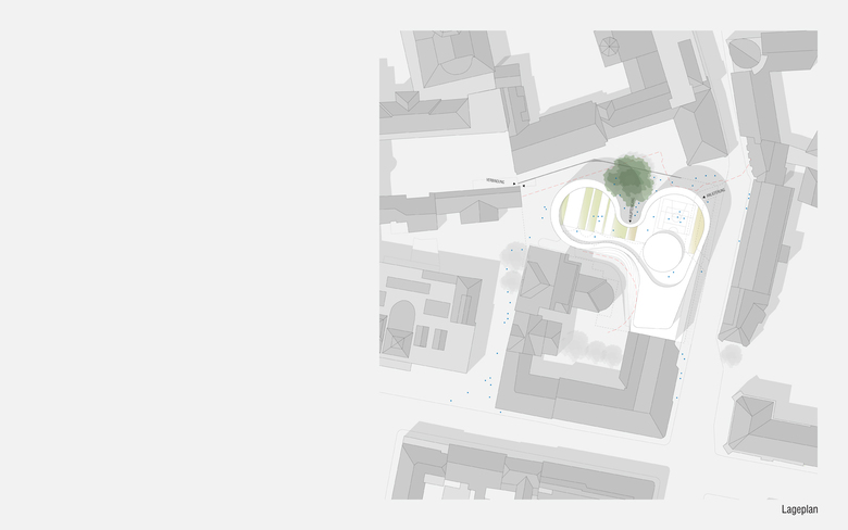 Kommen wir nun zur Stadt: Mitten in die Stadt setzen wir nun dieses "Turmdoppel". Seine geschwungene Kontur vermittelt zwischen Sillgasse und Paul-Hofhaimer-Gasse, geleitet SchülerInnen, LehrerInnen und PassantInnen selbstverständlich ins Innere dieses innerstädtischen, offenen Hofes zwischen diesen beiden Gassen, markiert logisch den Haupteingang und weicht nicht zuletzt dem Baumbestand aus, der somit identitätsstiftend erhalten werden kann.