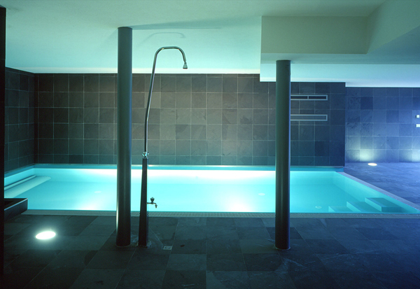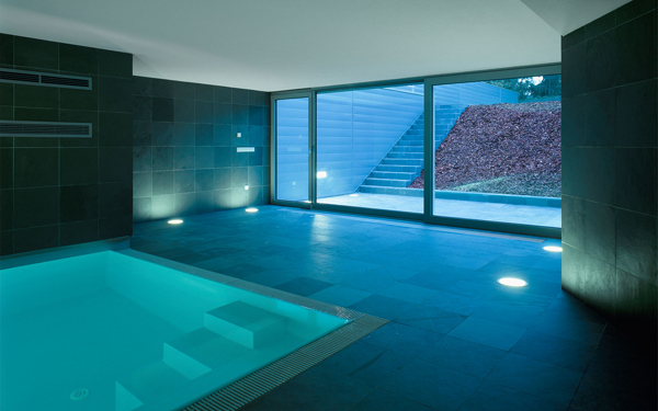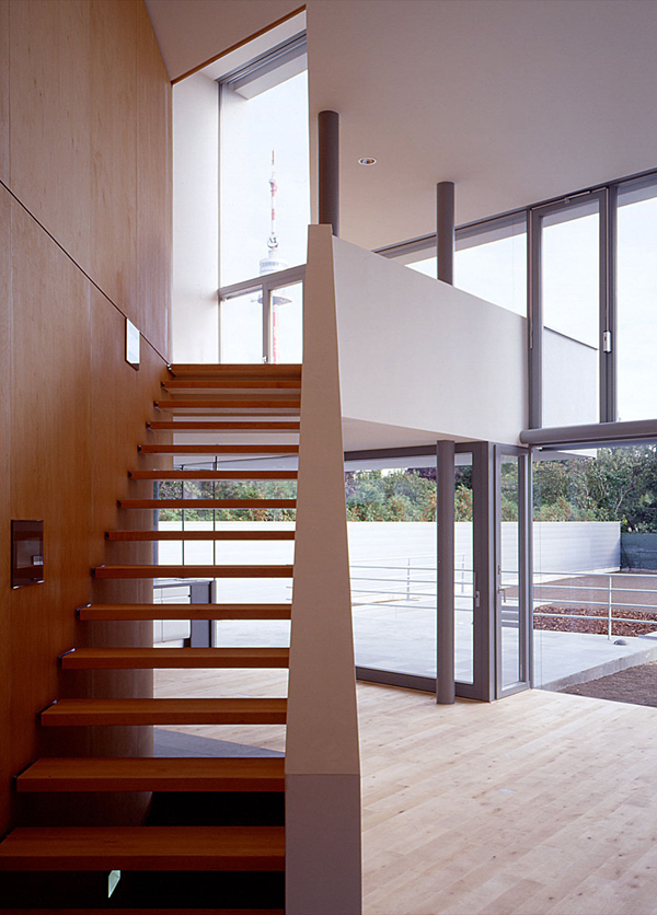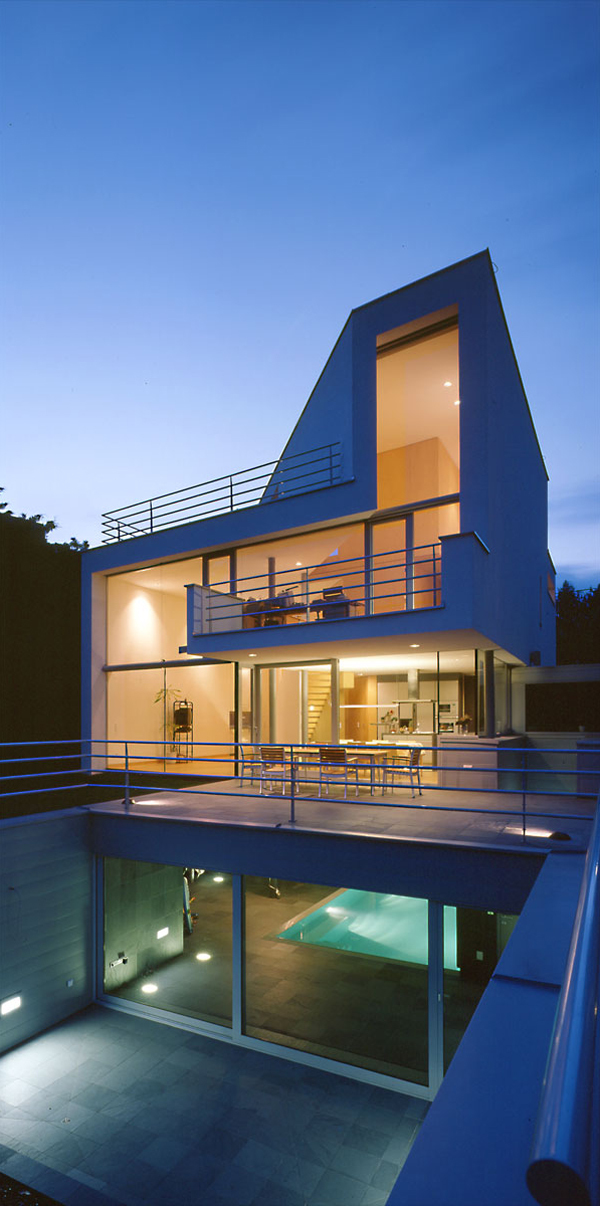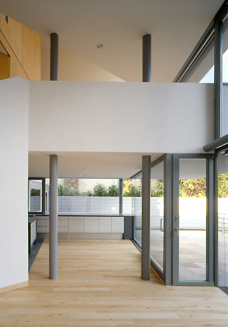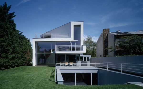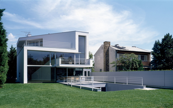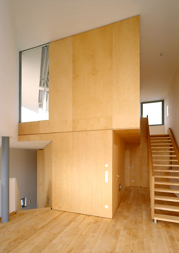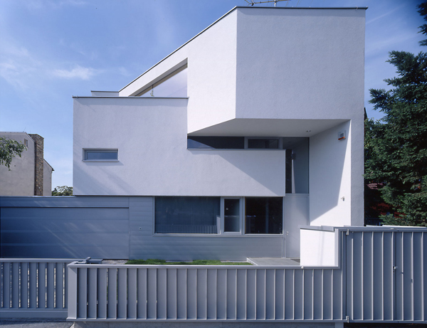 Ein großzügiges Haus auf kleiner Grundfläche. Zwei zweigeschossige Volumen miteinander verschränkt. Die Primärfigur entsteht aus der mehrfach gefalteten weißen Haut, die diese Volumen umhüllt. Sekundäre Figuren umspielen die Primärfigur, und sind mit Schiefer, Aluminiumblech oder Sperrholz belegt. Die Organisation erfolgt über eine räumliche Diagonale. In der Blickachse dieser Diagonale erscheint der Donauturm. Ganz nebenbei der Wiener Bauordnung ein zusätzliches Geschoß abgerungen.