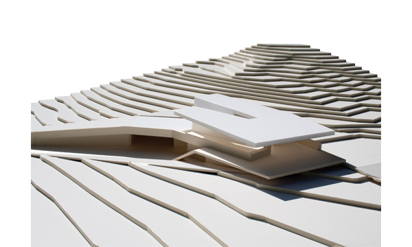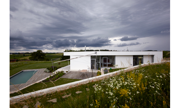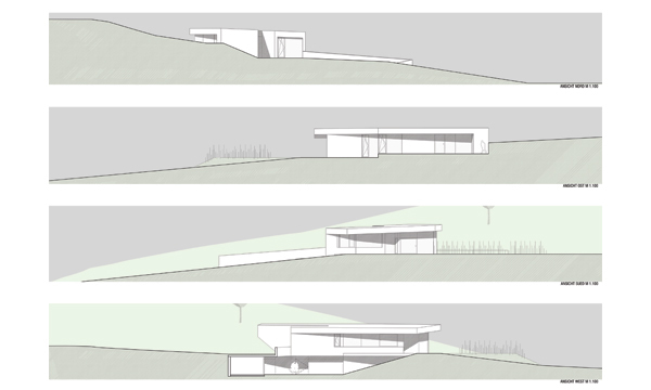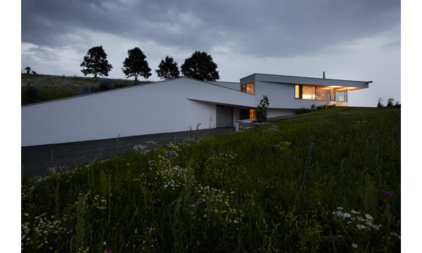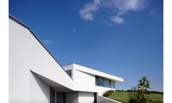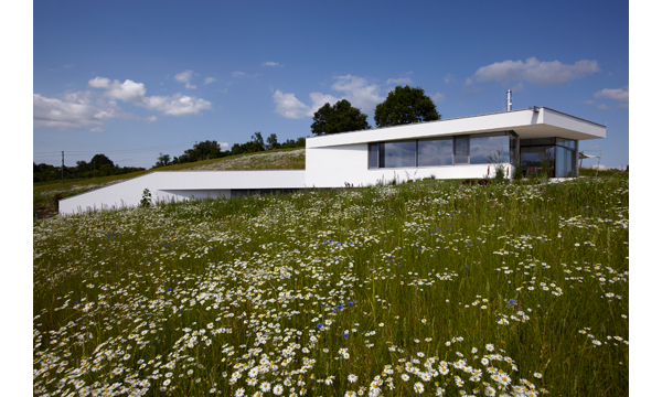 Der Baukörper ist im unteren Geschoß (Eingangsebene) nahezu vollständig ins Gelände eingebettet und nur im Eingangsbereich als Vollgeschoß wahrnehmbar. Freiliegende Dachflächen im Bereich der Garagenzufahrt sind als Gründächer ausgeführt. Eine nach Westen hin leicht geneigte Dachfläche greift die Neigung der Hangsituation auf, schafft eine moderate Höhenentwicklung und zugleich eine variierende Raumhöhe im Innenbereich.