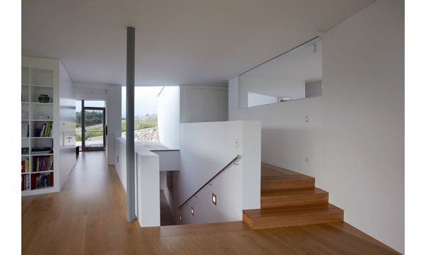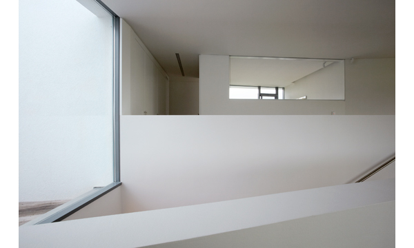 Die obere Wohnebene mit den privaten Wohnbereichen ist zur Gänze freigestellt. Großformatige, teils raumhohe Glaselemente formen weitgehend transparente, tageslichtdurchflutete Räume. Großzügige Terrassenflächen schließen an den Außenraum an, der in unmittelbarer Umgebung gärtnerisch gestaltet ist.