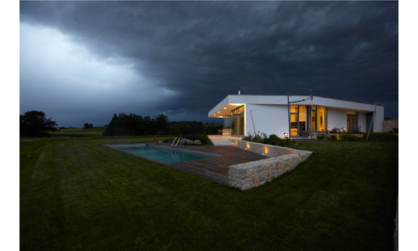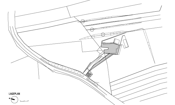 Das Projekt „Haus P-K“ liegt in Nordsüdausrichtung in einer Umgebung mit landwirtschaftlichem Charakter im Südburgenland, der erhalten bleiben soll. Die Zufahrt erfolgt von der Straße her aus nordwestlicher Richtung und ist als Geländeeinschnitt ausgebildet, der auf beiden Seiten mit einer begleitenden Böschung beginnt und sich dann mit einer Stützmauer kontinuierlich ansteigend als Bauelement aus dem Grund erhebt und bis zur Höhe eines Geschoßes zum Eingang hin entwickelt.