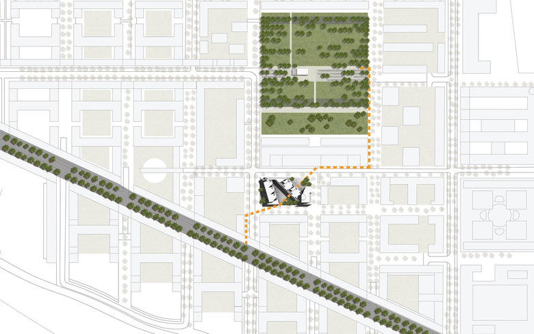 Als „ein Ort auf dieser Welt“ sitzt das Projekt an einer Schnittstelle eines sich neu entwickelnden Stadtteils, an der zwei Transformationsprozesse stattfinden: erstens der Übergang vom Freiraum der Parklandschaft (Rudolf-Bednar-Park mit Schule) zu einer städtischen Blockstruktur und zweitens der Übergang von einer orthogonalen hin zu einer diagonalen Struktur (zukünftige Bruno-Marek-Allee).