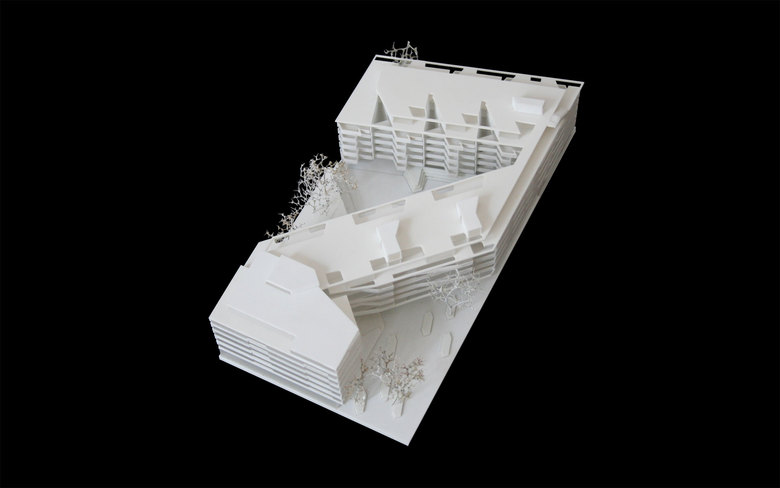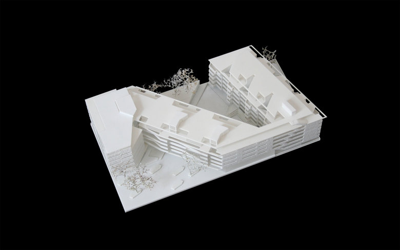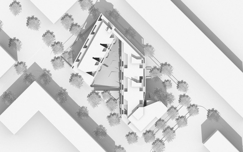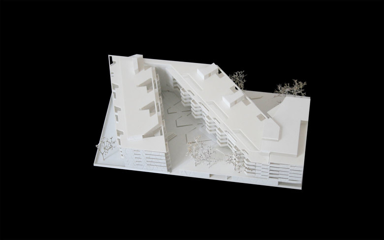 Aufgrund dieser Prozesse beginnt sich das Projekt auf dem vorge¬fun¬denen Baufeld frei zu bewegen, ohne jedoch die Markierung des Feldes aufzugeben. Die Bewegung bereitet jedoch den Schwenk zur Bruno-Marek-Allee vor und bietet eine Abfolge von unterschiedlichen Außen¬räumen: den zur Schule orientierten Platz, den nach Süden orien-tierten Wohnhof und den versunkenen Garten.