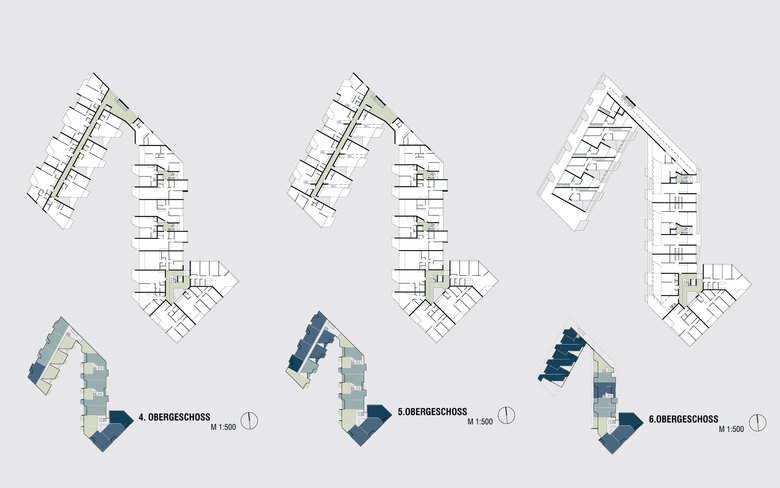 Diese Wohnungen sind nicht nur vertikal übereinander, sondern auch horizontal gegeneinander verschachtelt, sodass eine diagonale Bezieh¬ung und exakte Ost-West-Ausrichtung mit hochinteressanten Terrassen¬flächen entsteht. Einer der beiden Maisonette-Typen lässt sich von einer 4-Zimmer- zu einer 5-Zimmer-Wohnung verändern und der zweite ver¬fügt, als 4-Zimmer-Wohnung, über ein separates Zimmer im unteren Geschoß.
