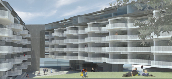 Das Mäandrieren des Baukörpers ermöglicht die Ost-West-Orientierung fast aller Wohnungen. Die Ost- und Westfassaden sind konsequenter¬weise durch komplexe Loggia- und Balkonstrukturen gegliedert, die ihrer¬seits durch mäanderförmige Linienführung gekennzeichnet sind. In noch kleinerem Maßstab wiederholt sich dieses Motiv des Mäanders in der Verwendung von halbtransparenten, gelochten Trapezblechbrüstungen und –sonnenschutzschürzen. So entsteht eine nahezu fraktale Struktur, die in der Lage ist, große Vielfalt in vielen Maßstäben einzubinden. Die Nord- und Südfassaden hingegen sind als ruhige Straßen- bzw. Platzfassaden mit großformatigen, silbergrauen Faserbetonplatten bekleidet.